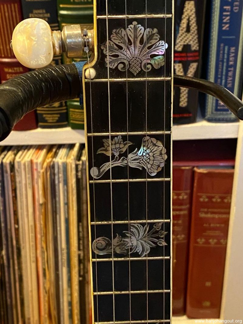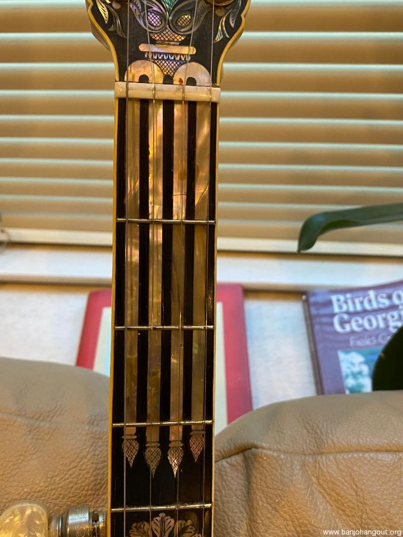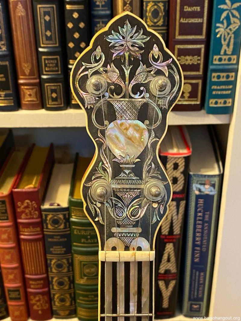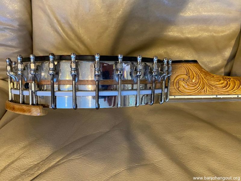 This gorgeous Unger presentation banjo has a 26" scale and a 10.5 inch head. The tubaphone tone ring gives it a bright sound that will cut through in a jam. The two-piece maple neck has a backstrap, a beautiful Unger heel carving, inlays on the back of the peghead and heel cap, and seven intricately engraved inlays plus mother of pearl lines through the first four frets. The flowerpot on the peghead has an abalone center and is as nice as I've seen. The serial# on the pot is 58400, and the nameplate (hard to see in the photo) reads D Unger. I've owned the banjo since 2018 and am not the original owner. The neck is 1.25 inches at the nut and is deeper than most. I'll be happy to answer any other questions I can about this classic instrument. Hard shell case included.