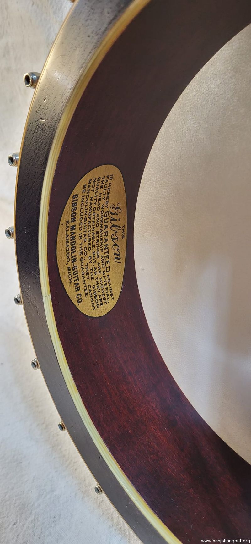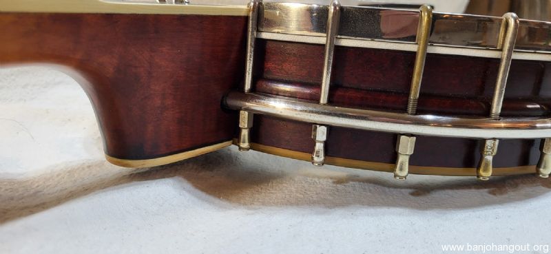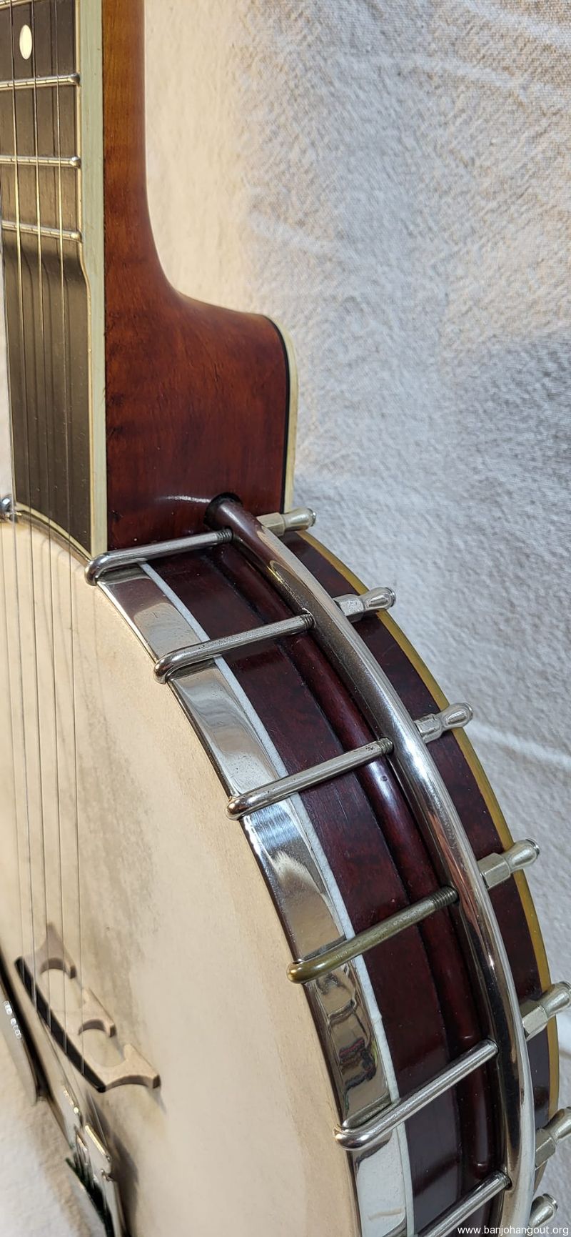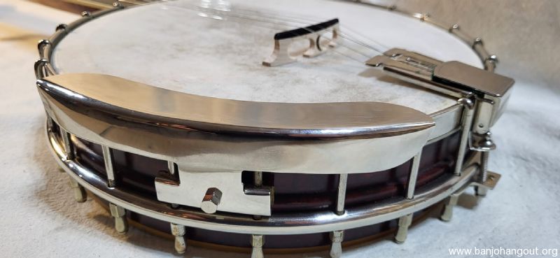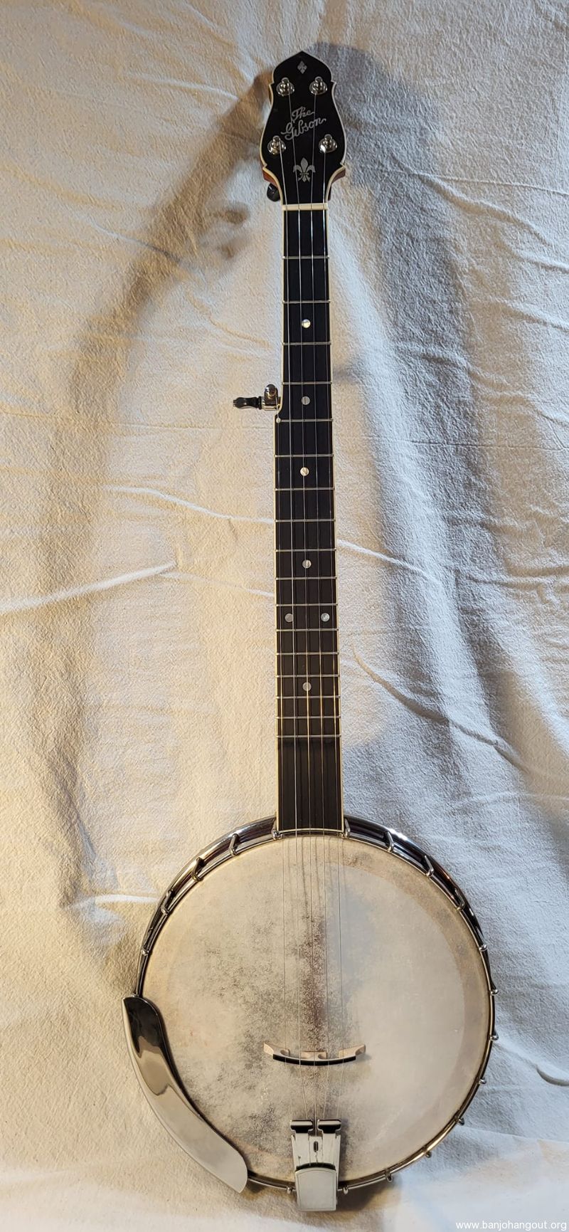 Very nice and original Gibson Circa 1920 Mandolin banjo with a new five strings neck. The 10 1/2 inches Kraske hollow rim only needed some repair on the rim cap. The hardware is original except for one tension hook, the Gibson presto tailpiece and the Gibson armrest that are from Gibson but from a different time period. New goatskin head and moon bridge. The two piece neck is 25 1/2 inches scale with a 3/8 inch string spacing, made of local lightly curl red maple and Indian ebony, two way truss rod, mother of pearl hand cut inlays, bone nuts. Gotoh tuners. Superior hard shell case included. Sweet old time unique sound of the Kraske rim.