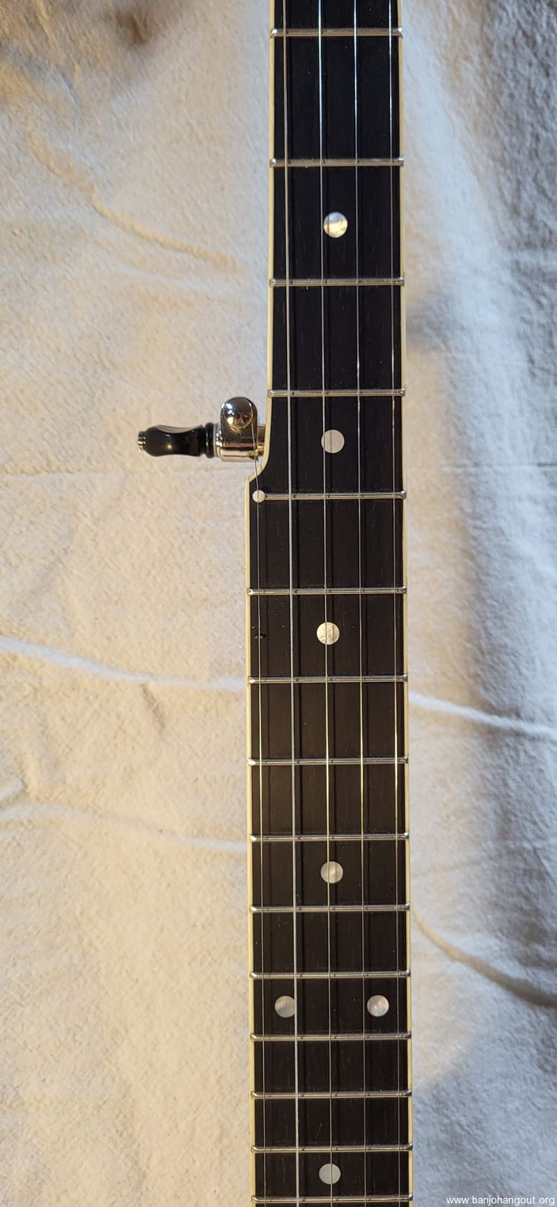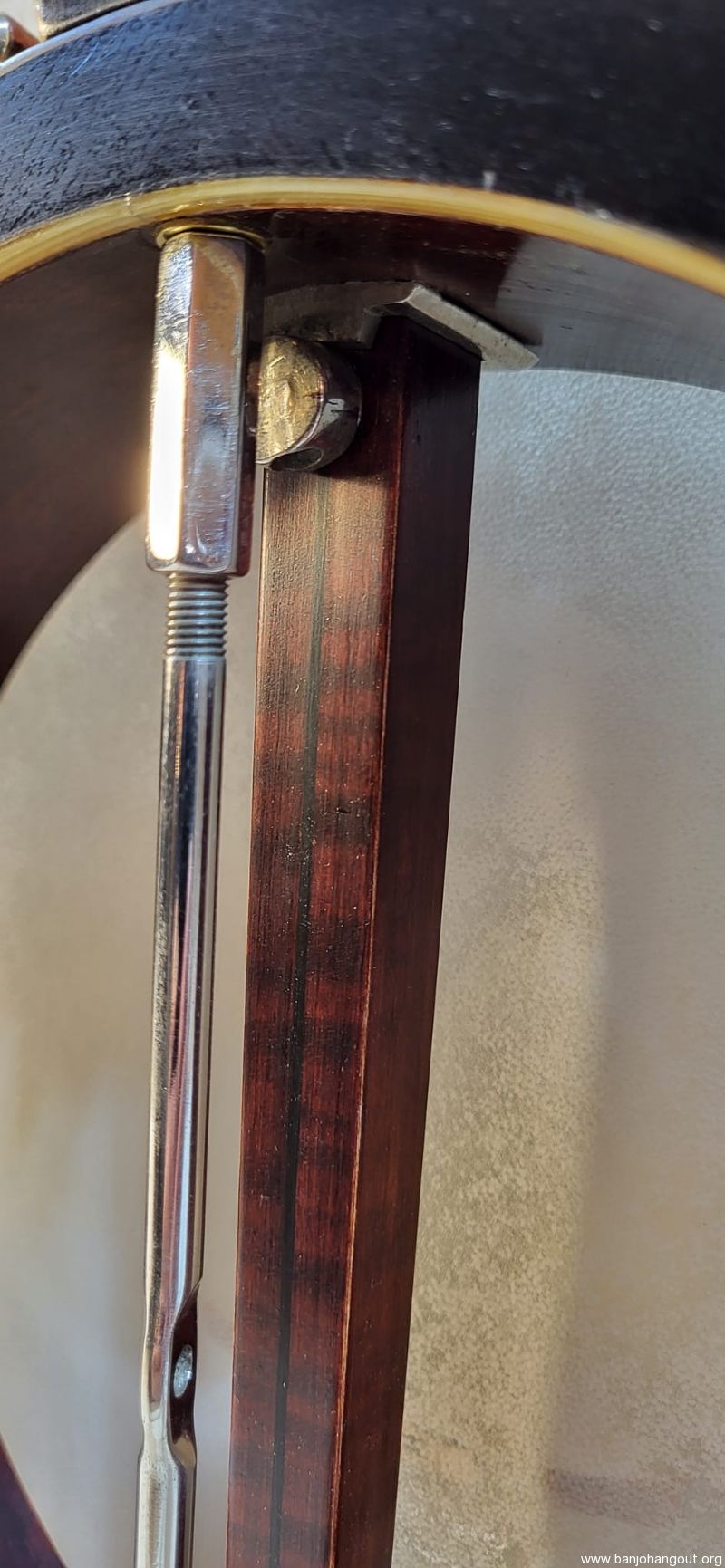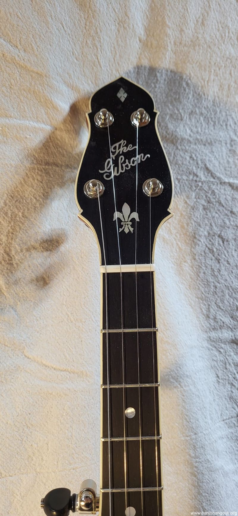 Very nice and original Gibson Circa 1920 Mandolin banjo with a new five strings neck. The 10 1/2 inches Kraske hollow rim only needed some repair on the rim cap. The hardware is original except for one tension hook, the Gibson presto tailpiece and the Gibson armrest that are from Gibson but from a different time period. New goatskin head and moon bridge. The two piece neck is 25 1/2 inches scale with a 3/8 inch string spacing, made of local lightly curl red maple and Indian ebony, two way truss rod, mother of pearl hand cut inlays, bone nuts. Gotoh tuners. Superior hard shell case included. Sweet old time unique sound of the Kraske rim.