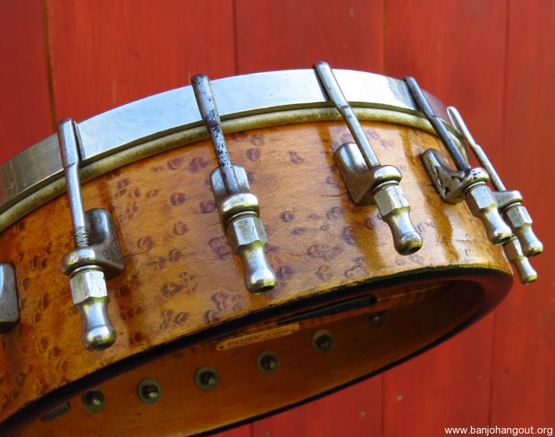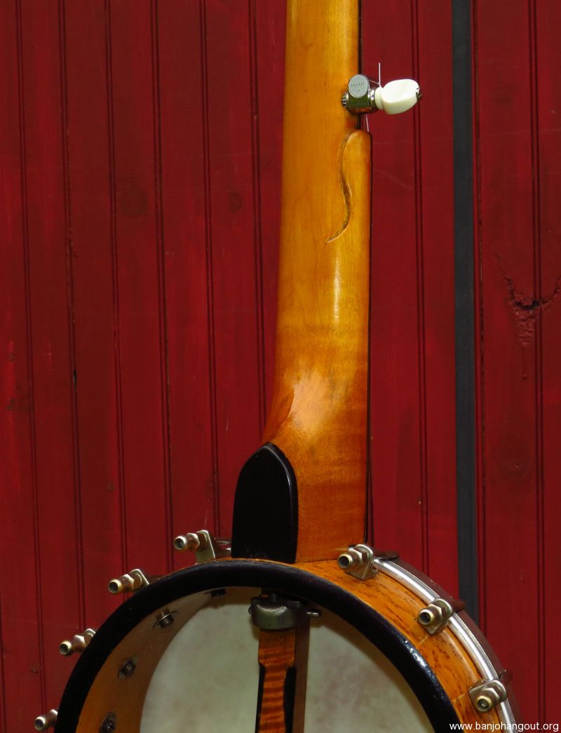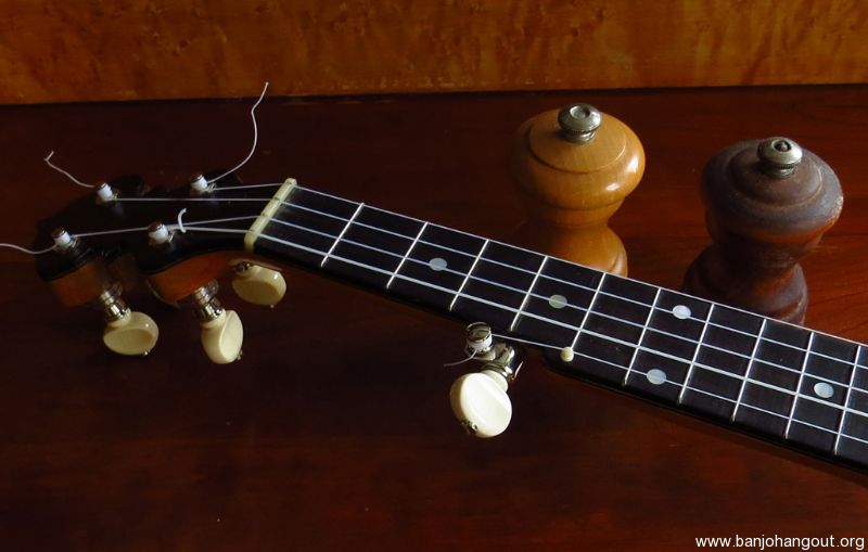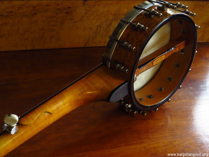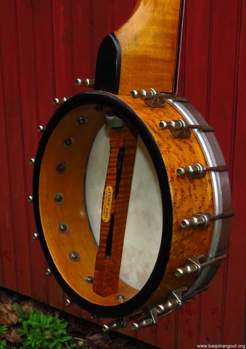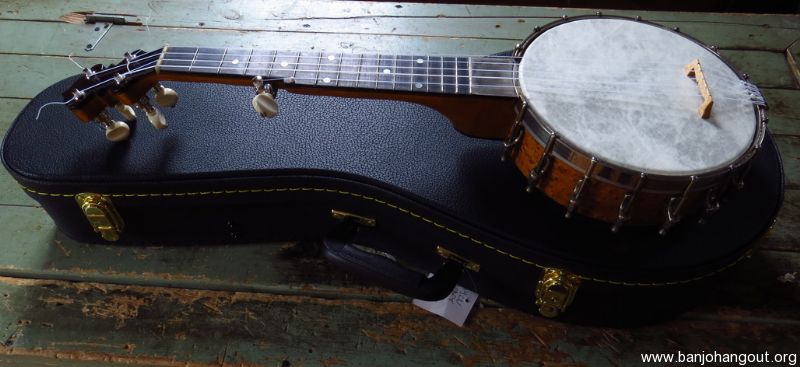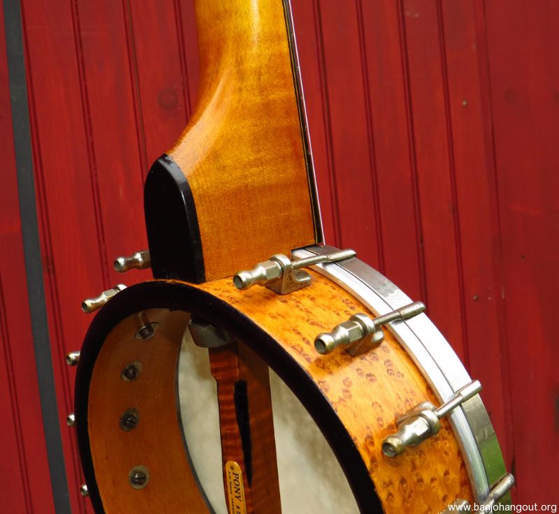 Rugged and heavy Pony sized banjo, with 8" rim and 12" neck, with a scale length of 18". Great sounding steel tone ring in this original 1920's style 24 pot and assembly. The head is Fiberskyn, with geared tuners on all 5 strings. The buttons are ivoroid. Ebony, bone, curly maple, and a very distinct birds eye maple comprise this substantial little banjo. The end of the fingerboard is brass.