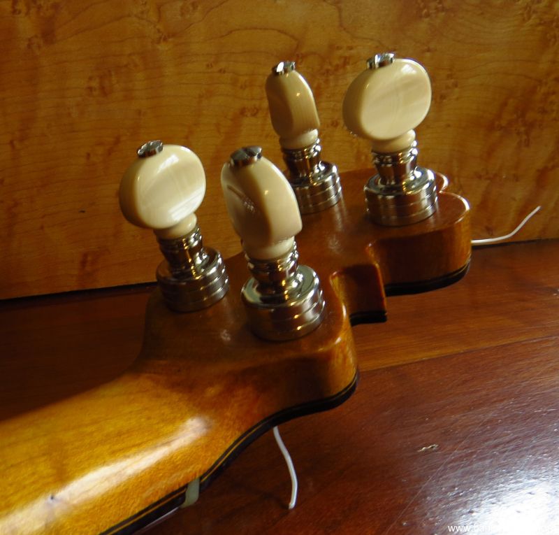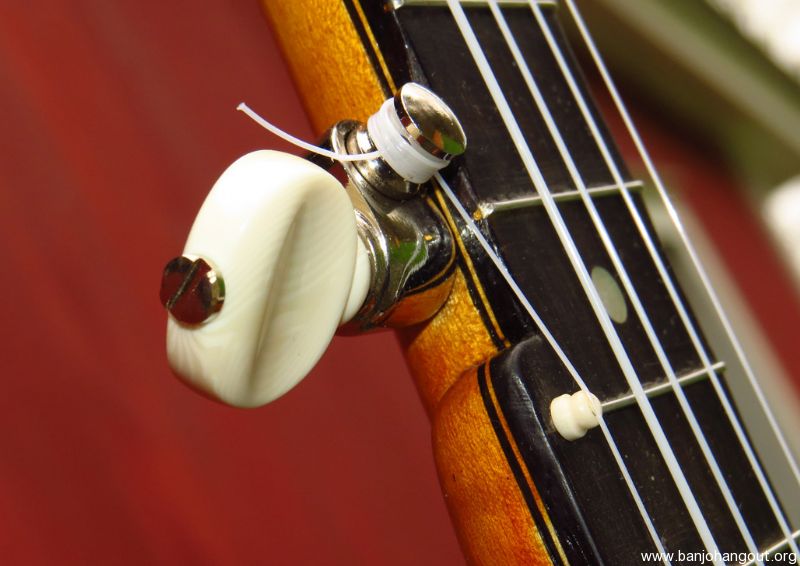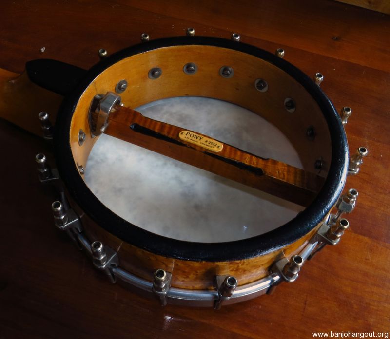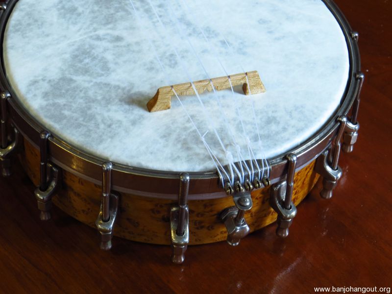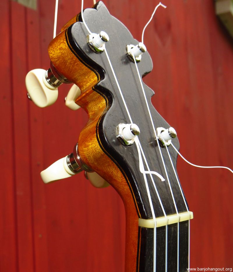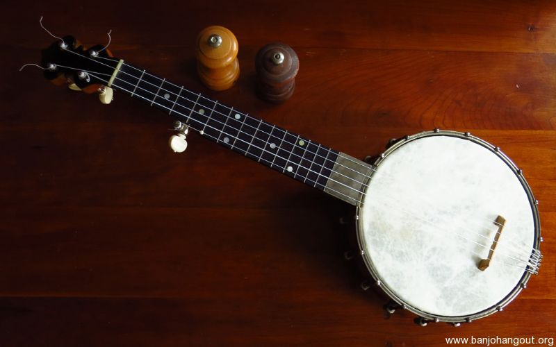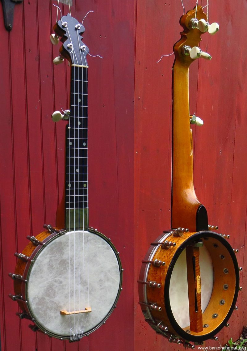 Rugged and heavy Pony sized banjo, with 8" rim and 12" neck, with a scale length of 18". Great sounding steel tone ring in this original 1920's style 24 pot and assembly. The head is Fiberskyn, with geared tuners on all 5 strings. The buttons are ivoroid. Ebony, bone, curly maple, and a very distinct birds eye maple comprise this substantial little banjo. The end of the fingerboard is brass.