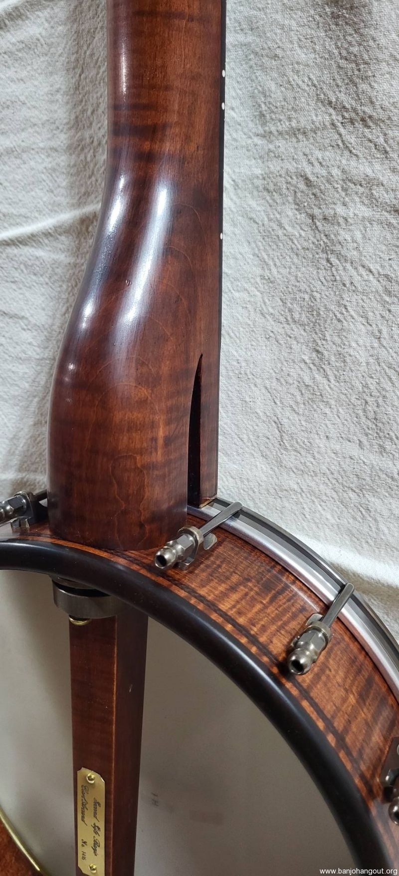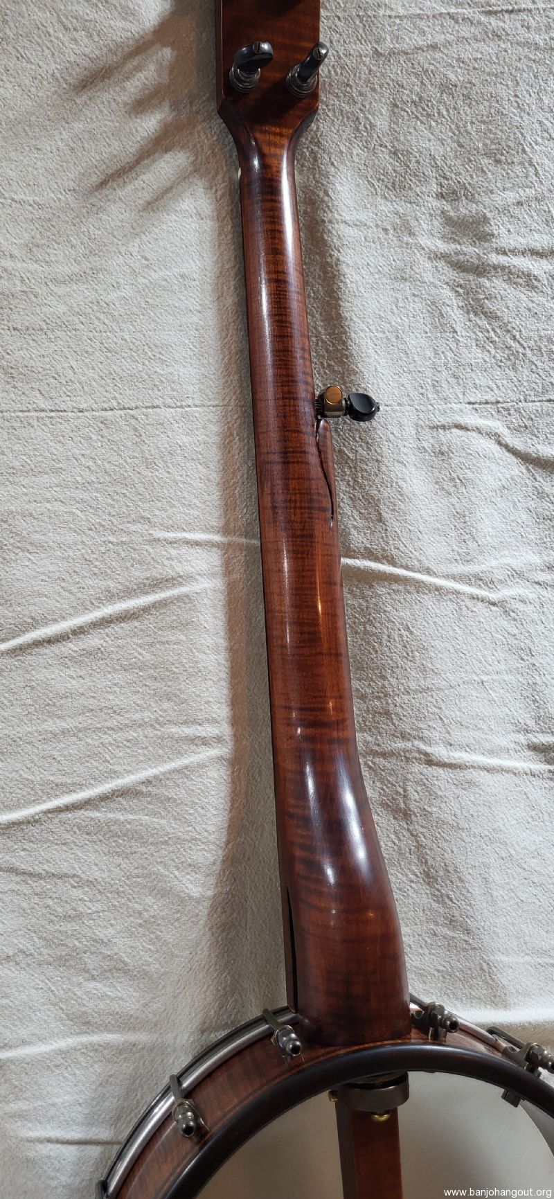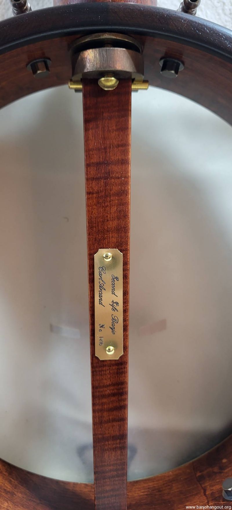 11 inches curly maple rim with a ebony rim cap and marquetry binding. Round rod tone ring , 3 inches deep pot. Aged brass solid brass hardware. Renaissance head. Arcand sound opener tailpiece . Curly maple one piece neck with ebony fingerboard headstock veneer and rim cap,25 1/2 inches scale, 1 3/8 bone nut. two way truss rod. Gotoh brass tuning machine. medium gauge steel strings. 5/8 moon bridge. Gold fret-wire. Curly maple and brass armrest. Hard- shell case and Gig bags available. Plated Second Life Banjo / Carl Arcand Build to last and ready for music.
