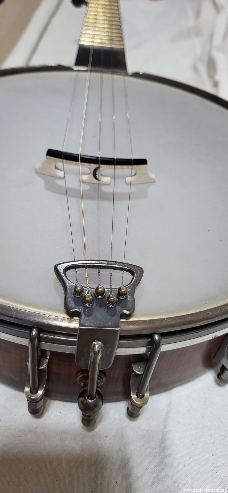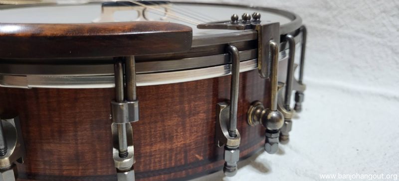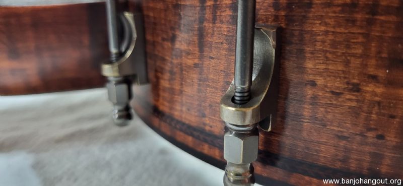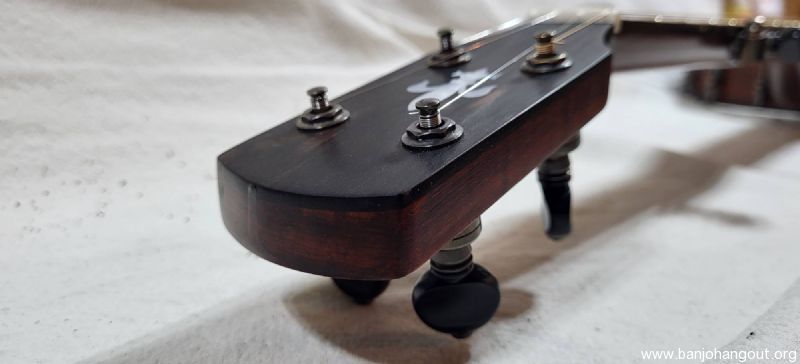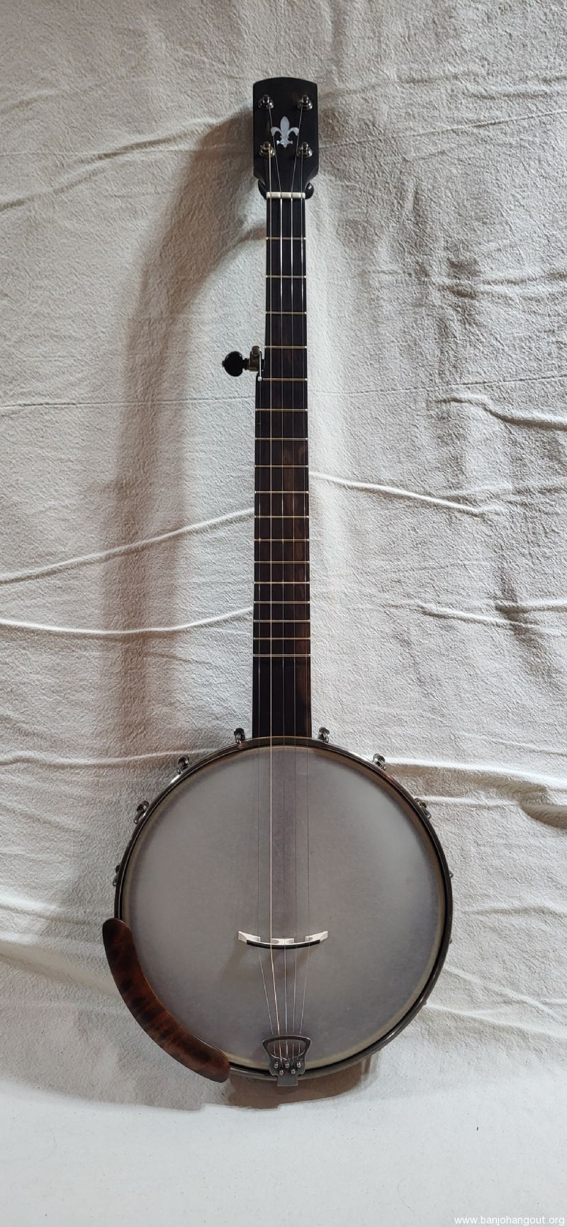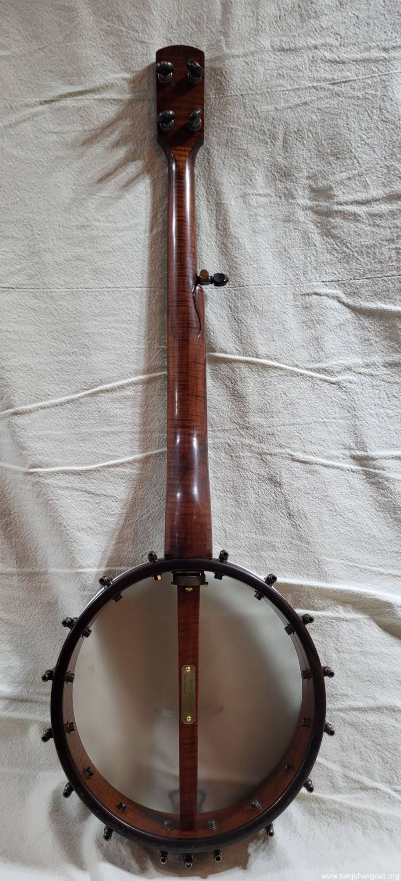 11 inches curly maple rim with a ebony rim cap and marquetry binding. Round rod tone ring , 3 inches deep pot. Aged brass solid brass hardware. Renaissance head. Arcand sound opener tailpiece . Curly maple one piece neck with ebony fingerboard headstock veneer and rim cap,25 1/2 inches scale, 1 3/8 bone nut. two way truss rod. Gotoh brass tuning machine. medium gauge steel strings. 5/8 moon bridge. Gold fret-wire. Curly maple and brass armrest. Hard- shell case and Gig bags available. Plated Second Life Banjo / Carl Arcand Build to last and ready for music.