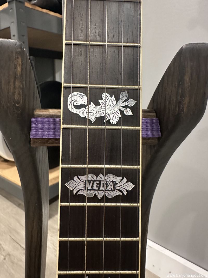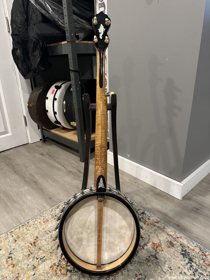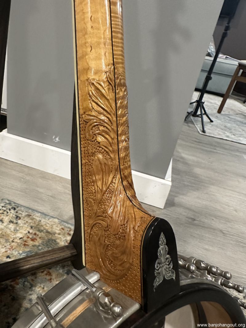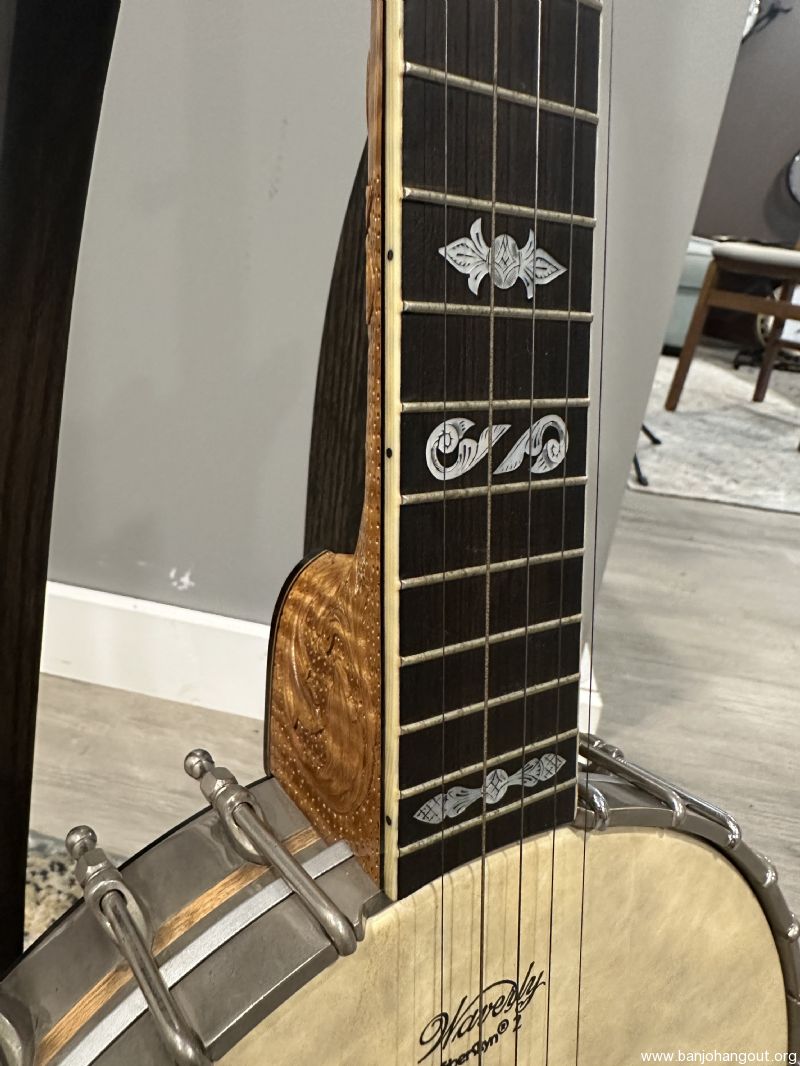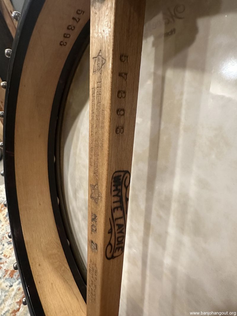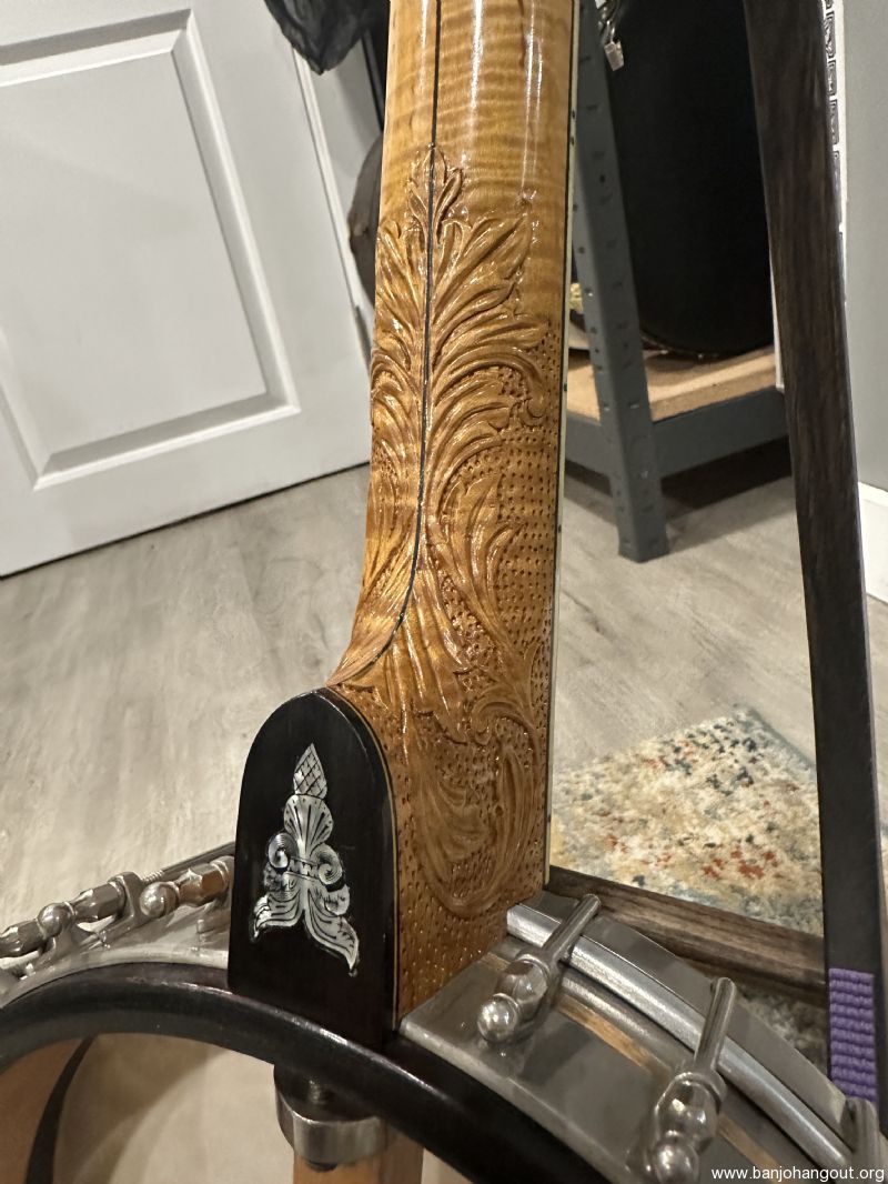 Stunning Custom Banjo Featuring Original Whyte Laydie Pot & Wyatt Fawley Carved Neck – Serial #57393 This exquisite banjo blends historic craftsmanship with exceptional artistry, making it a standout collector’s piece and a joy to play. Featuring an original pot assembly with a classic Whyte Laydie tone ring, this instrument captures the brilliance and tonal clarity that has made the Whyte Laydie a favorite among old-time and clawhammer players for over a century. Tis banjo features a hand-carved maple neck by Wyatt Fawley, one of the most respected banjo neck builders in the modern era. This neck is a work of art, with elaborate foliate carving at the heel and a beautifully shaped headstock layered in ebonized wood. The craftsmanship is nothing short of masterful. Specifications: Serial Number: 57393 Pot: Original Vega-style rim, maple construction with tortoiseshell-patterned plastic binding and herringbone wooden purfling Tone Ring: Classic Whyte Laydie style, nickel silver with 31 cobra hooks and hexagonal ball-end nuts Neck: Hand-carved flamed maple by Wyatt Fawley with foliate carving at the heel Fingerboard: Ebony, bound in faux ivory, with engraved pearl inlays (foliate motifs and griffin head) Headstock: Maple core with ebonized front and back veneers, pearl inlays on both faces Nut: Ivory Frets: 22 frets, nickel silver Bridge: Later replacement, maple Armrest: Original adjustable wire style, stamped VEGA Case: Includes period-correct hardshell case