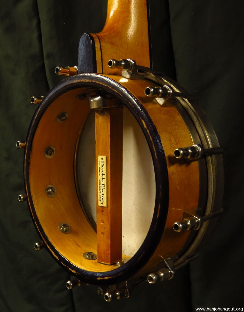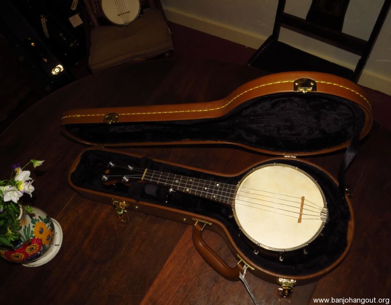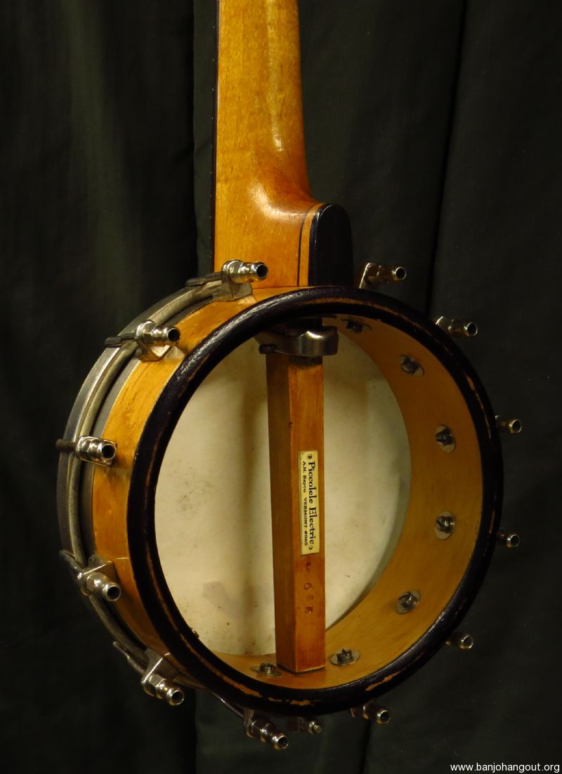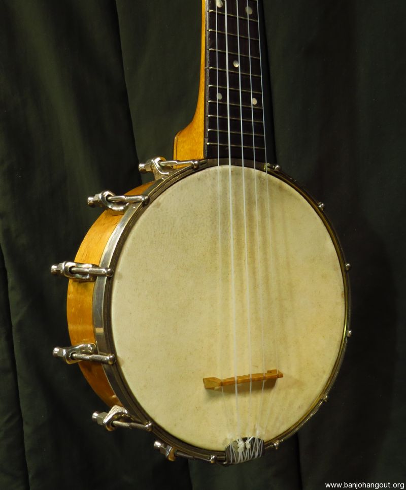 A very tiny 5 stringer slightly smaller than a S.S. Stewart piccolo banjo as pictured. Don't be fooled by the size as this banjo sports a electric style tone ring made of solid brass, similar to the Vega Whyte Ladie tone ring, yielding a strong and even response.