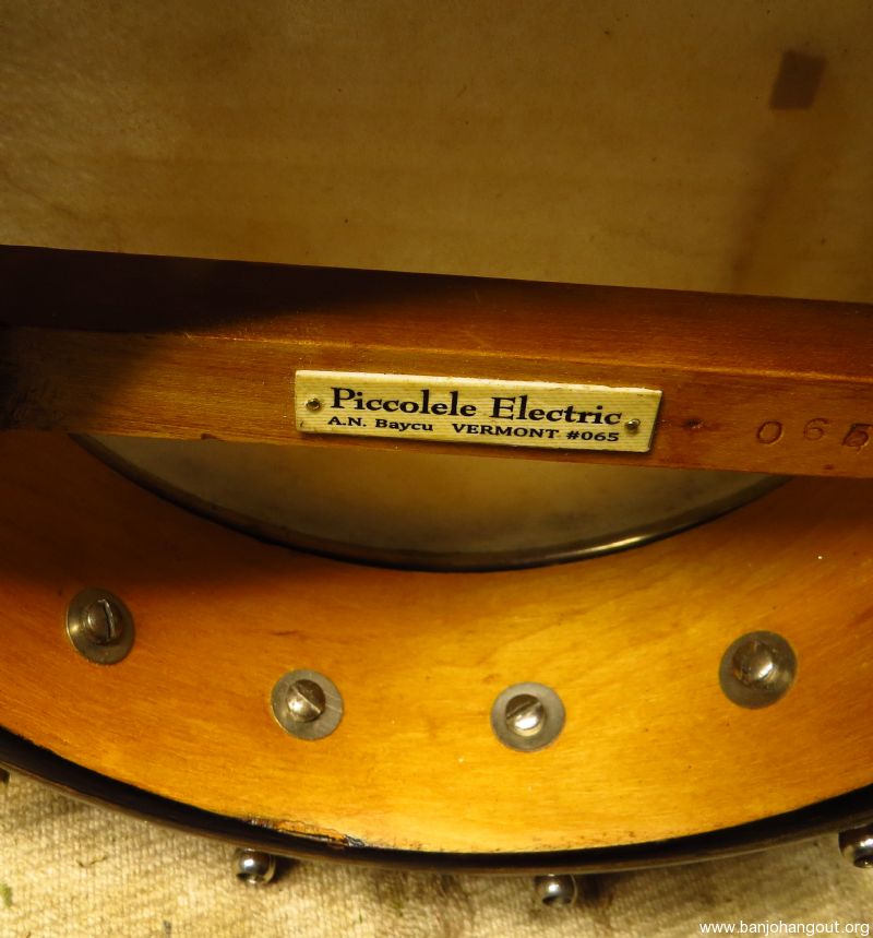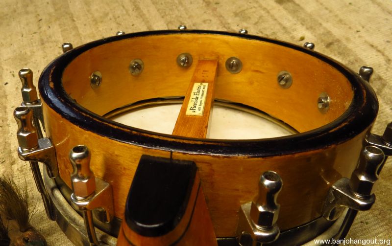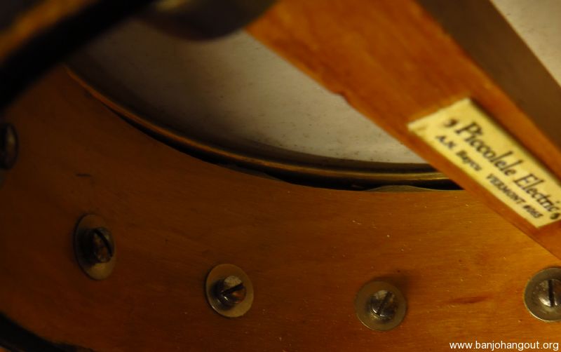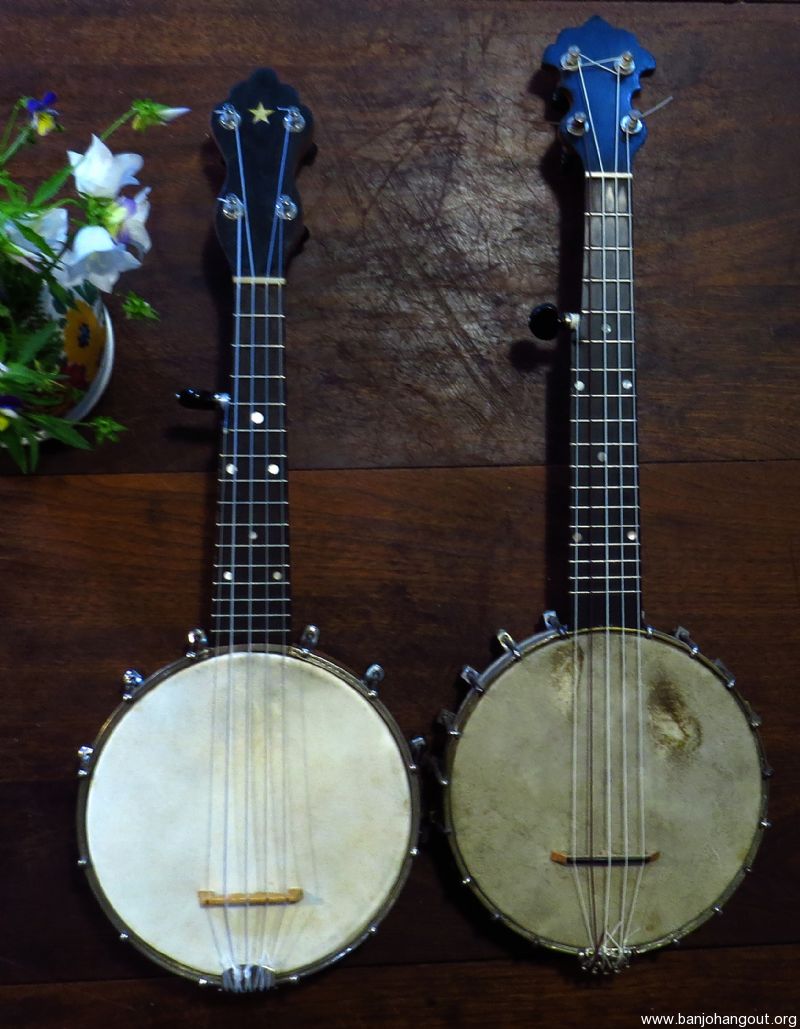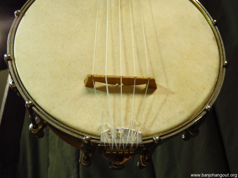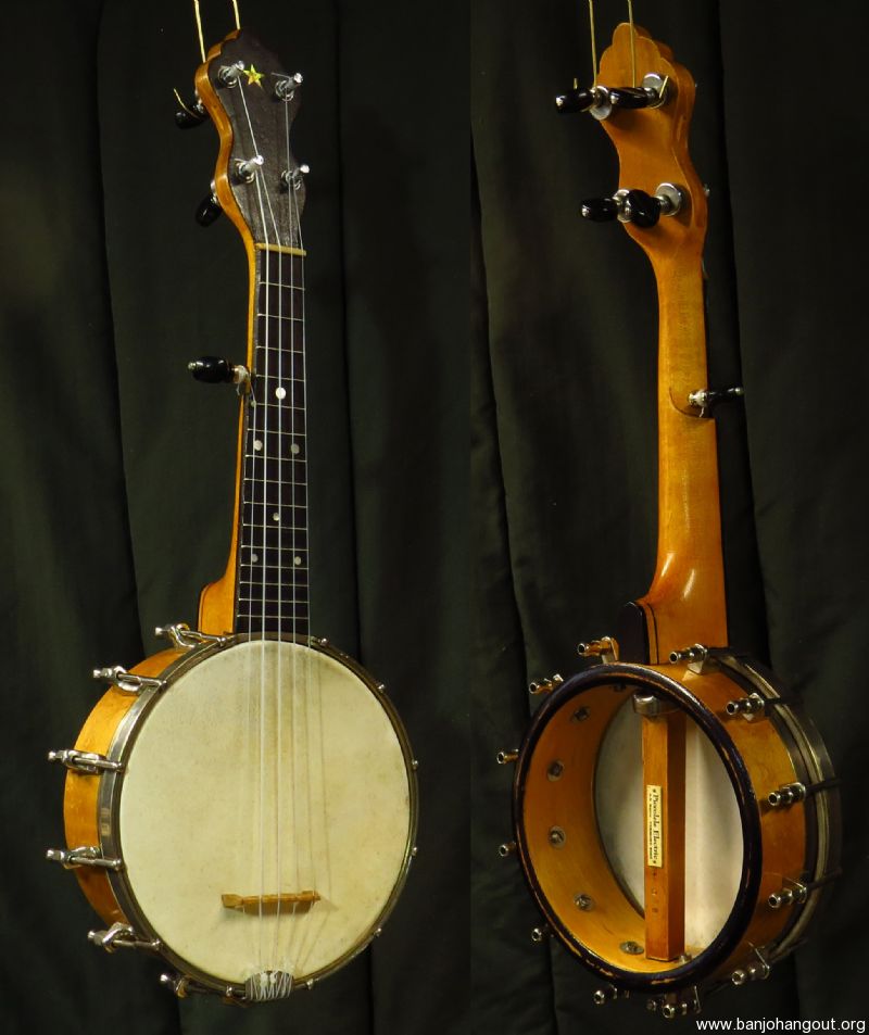 A very tiny 5 stringer slightly smaller than a S.S. Stewart piccolo banjo as pictured. Don't be fooled by the size as this banjo sports a electric style tone ring made of solid brass, similar to the Vega Whyte Ladie tone ring, yielding a strong and even response.