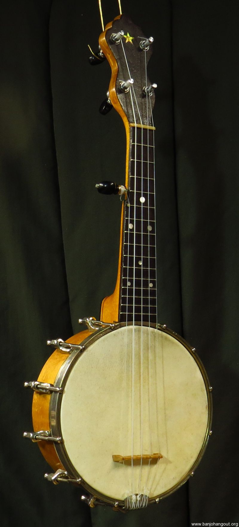 The 6.75 in rim is a 1920's model 23 Slingerland banjo uke rim and hardware, all very heavy and excellent condition. The Slingerland rims and hardware were amongst the best of the 1920's banjo ukes. The scale is 13 in and the neck length 8 in. Overall length is around 21 in, and fits nicely in the banjo uke case.