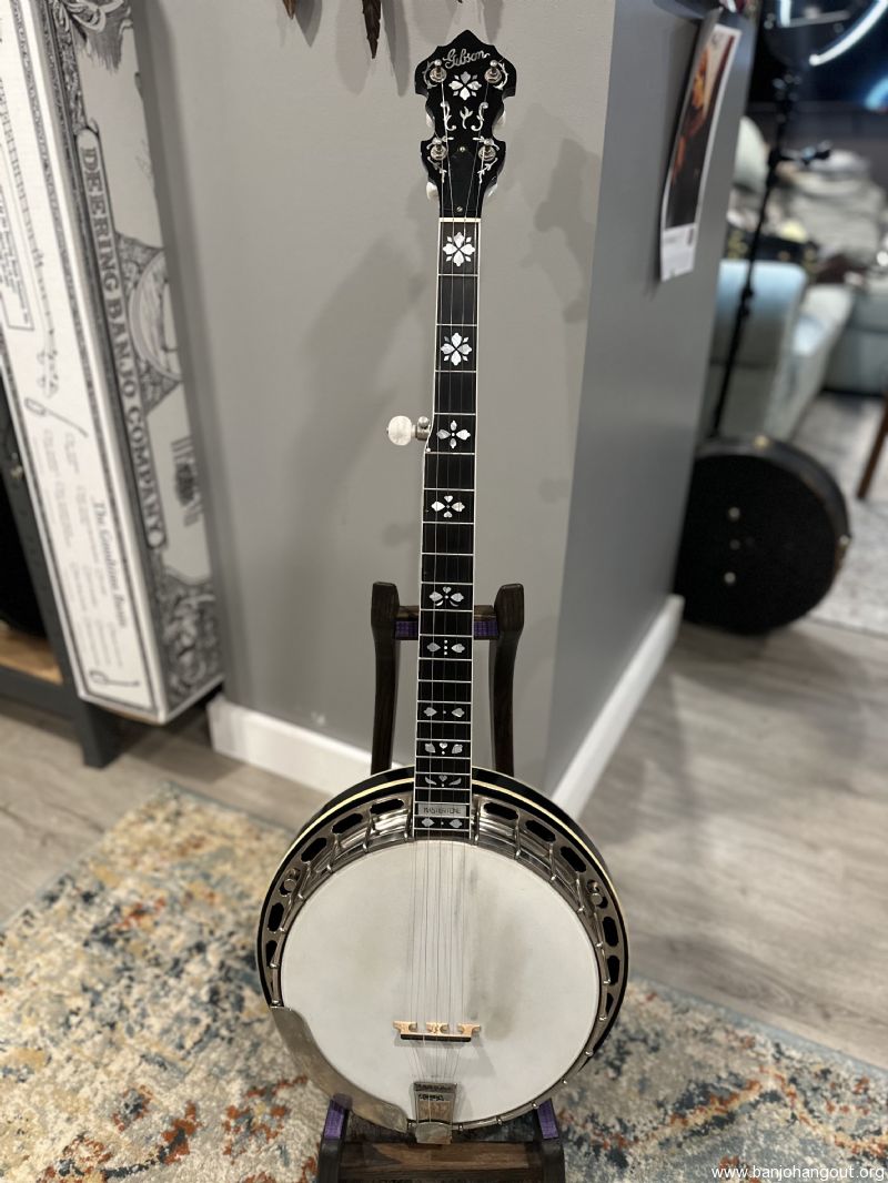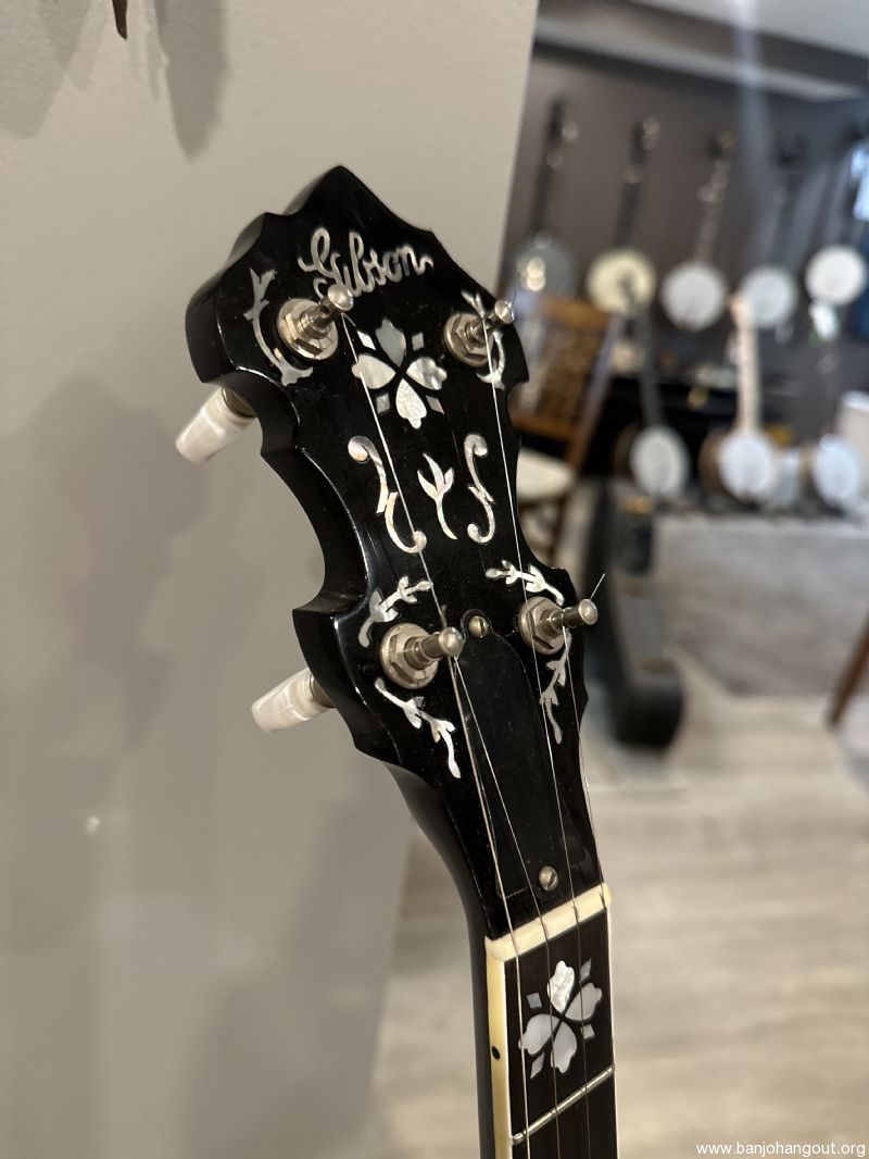 1930s Gibson (Kel Kroydon) Style 10 with a Modern Gibson 5 String Earl Scruggs, Hearts and Flowers Neck! We're told this Gibson Neck was installed by the factory in the early 2000s and specifically made for this banjo. Note the perfect color match on the back of the neck to the sidewalls of the resonator. It has a modern Gibson 20 hole flathead tone ring, and all of the other original Pre war Gibson metal parts including the original 'window pane' tailpiece. Recent setup - sounds and plays exactly as it should with a nice Scorpion bridge!
