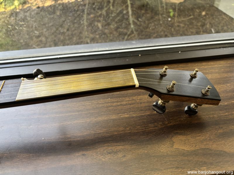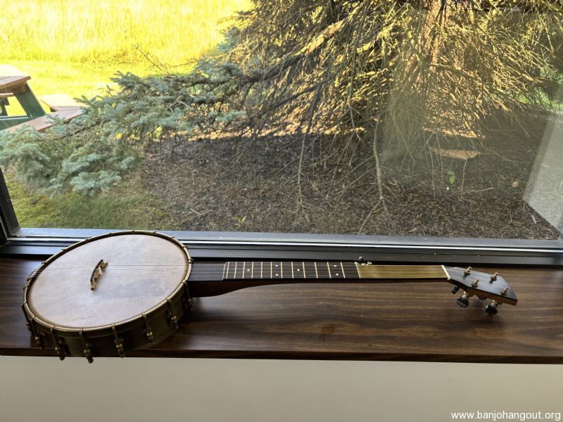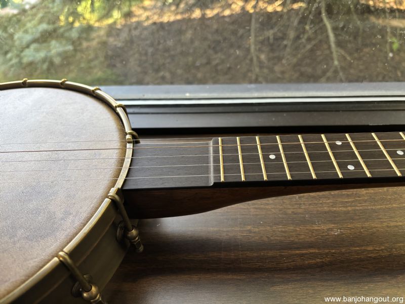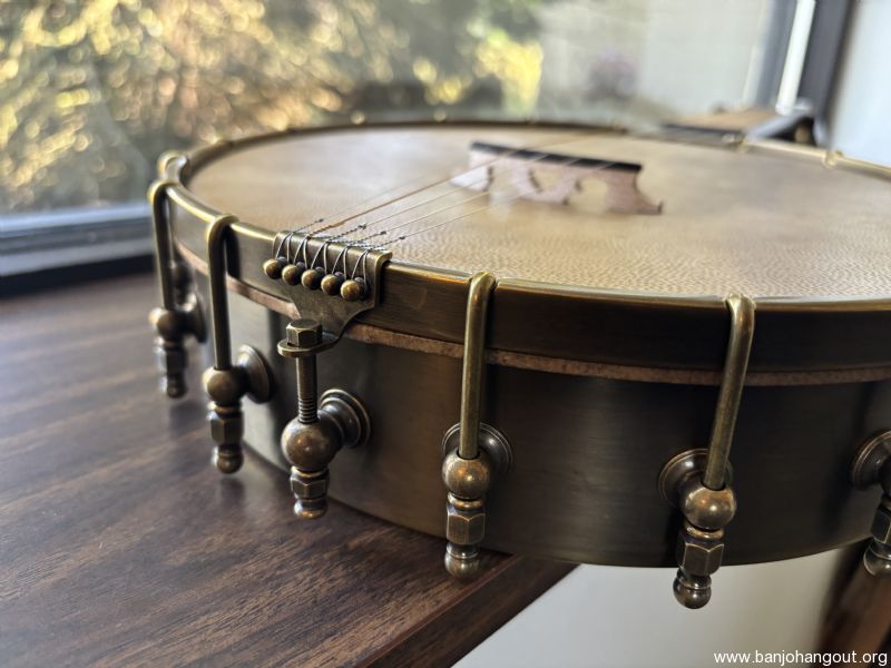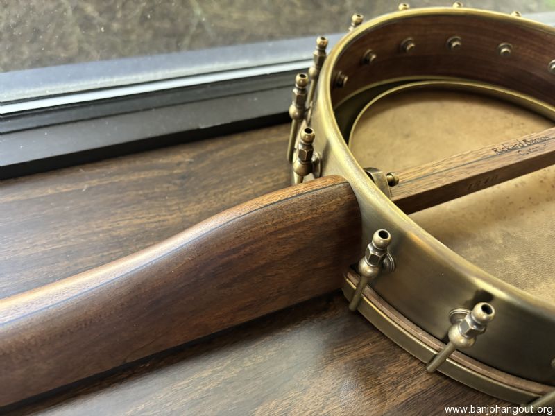 Bought new in 12/24. Barely played it. -11 Inch Rickard Spunover Walnut Dobson Banjo w/Deluxe Hardshell Case -Maple Neck with Two Way Adjustable Truss Rod Dobson Style Heel / Std Paddlehead -All hardware to be raw brass including Dobson Tone Ring, 18 Notch Tension Hoop, Wide Base Shoes, Hooks, Openball Nuts, Dowel Stick Hardware and Ferrule, No-Knot Tailpiece, Rickard Cyclone 10:1 Ratio Tuners 25.5” Scale Ebony Fretboard *** Straight Scoop without Brass Plate *** Acrylic Dots with Star inlay and Side Dots Rickard Cyclone 10:1 Ratio Tuners (Antiqued Brass) with Ebony Buttons Gold Fretwire Remo Renaissance String Height set to 3/32” At 12th Fret 5/8” Maple Bridge Antiqued Brass Option Spunover Walnut Upgrade Semi-Fretless to 5th Fret - Straight Cut Straight Cut Scoop Without Brass Scoop Plate Goat Skin Head