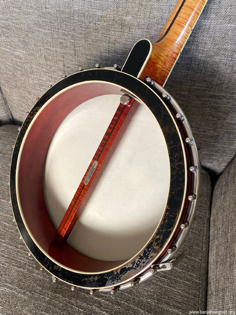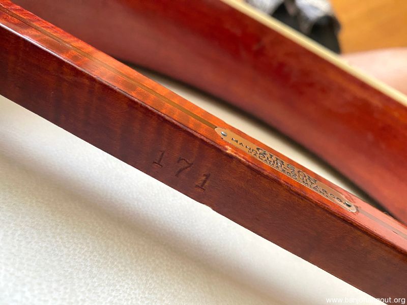 Here is a super clean, all original, 1918 Gibson TB Banjo. This is THE first model banjo Gibson made, and also the first year they made them (1918) This one is serial number 171 (very early) All original matching hooks/nuts, tuners, case. Original bridge in the case along with tenor chord booklet. This looks like it was hardly played. Insane flamed neck and dowel stick. This plays and sounds great!!