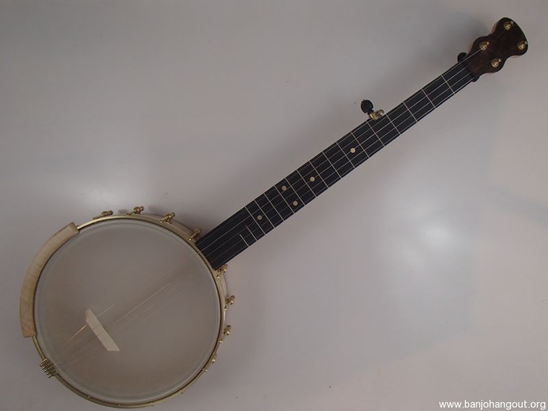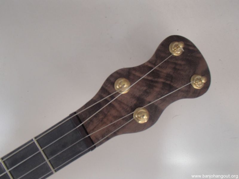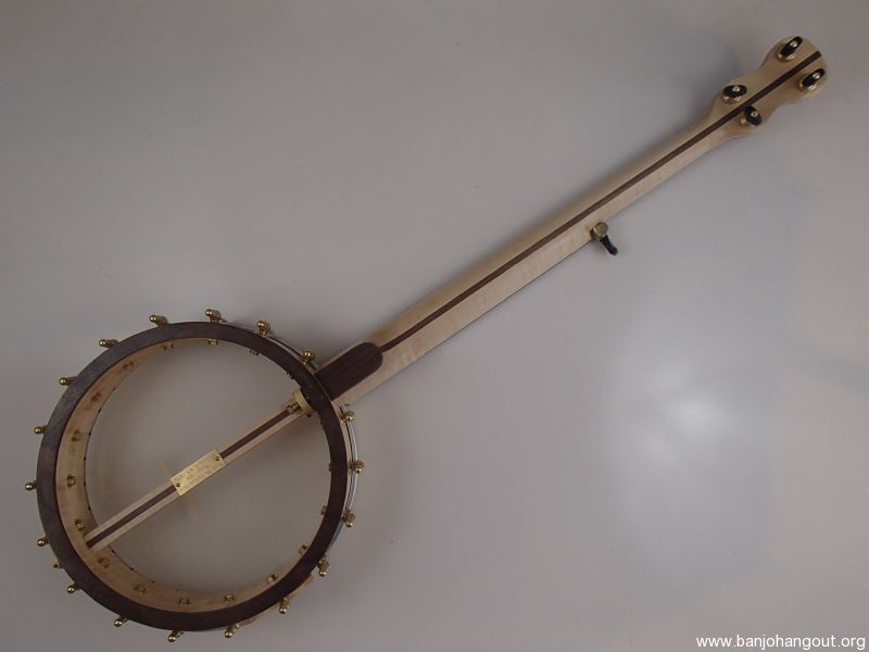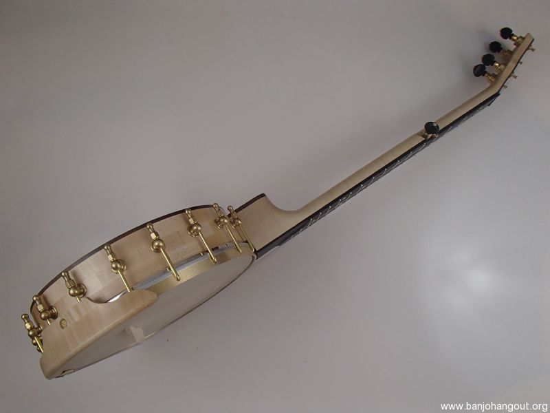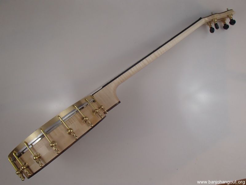 The wood is curly maple with walnut trim, and a Blackwood Tek fretboard. Greg Galbreath of Buckeye Banjos is now importing these fretboards, which are a very nice ebony substitute, and I am glad that he has made them available again in the US. The nut width is 1-3/8" and the scale length is 25.5" There is a two way truss rod in the neck which is accessed from the heel, after removing the neck. The dots are brass and the nut and pip are Corian. The banjo has a Tru Oil finish.