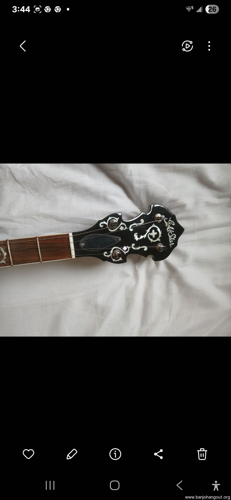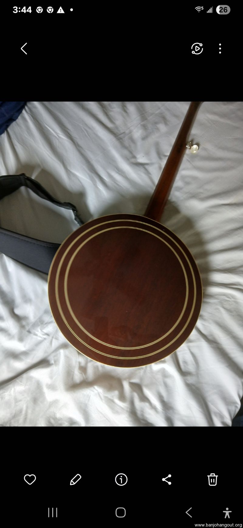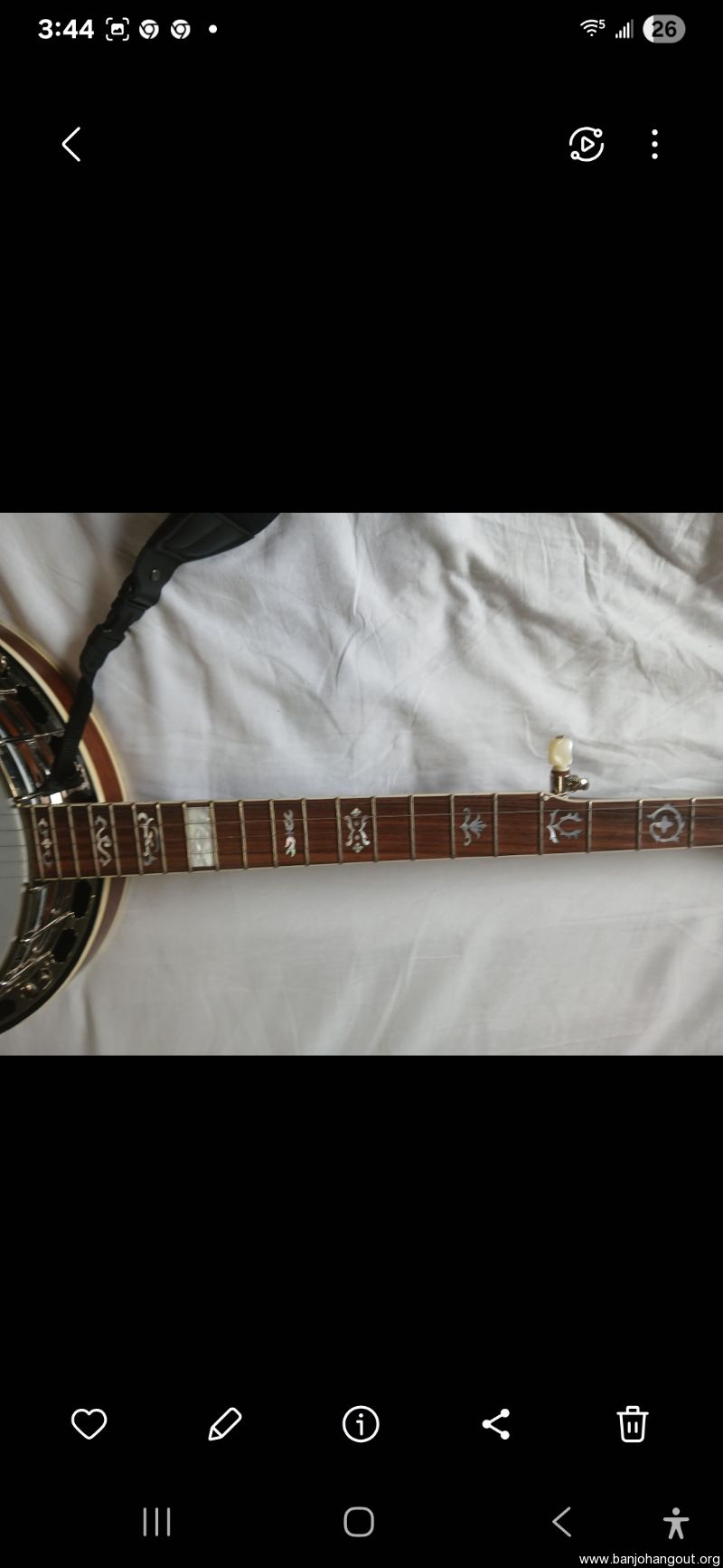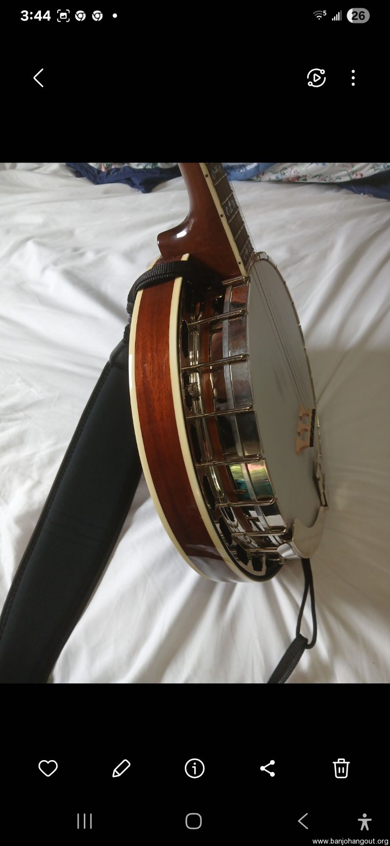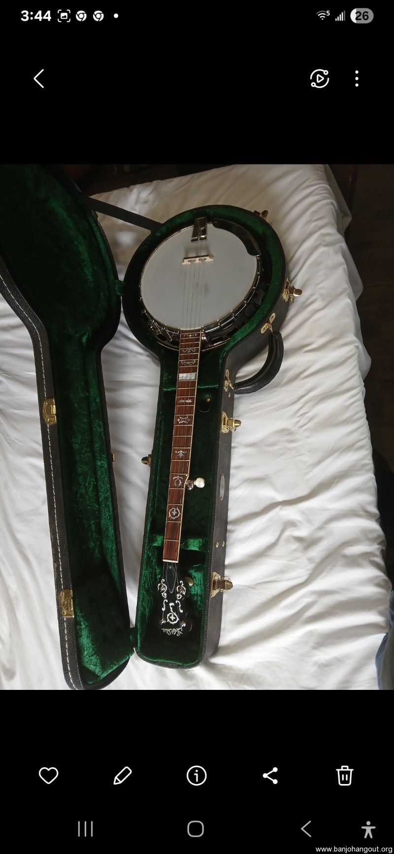 VERY NICE !!! Like New condition, doesnt have a scratch on it.....Has 20- hole CAST BELL BRONZE flat head tone ring, 3- ply rock maple rim, bound mahogany neck, rosewood fingerboard, real mother of pearl "wreath" inlay design in neck, deluxe planetary tuners, granada resonator, with dual concentric rings and dual coordinator rods. Also has Superior brand hard shell case with extra thick padding, 6 latches, and a large interior compartment that has mu h more room inside it than many cases do, and the ergonomic strap on it will fit inside it. Thia banjo sounds AWESOME!! And the fretboard has virtually no wear at all on it.....