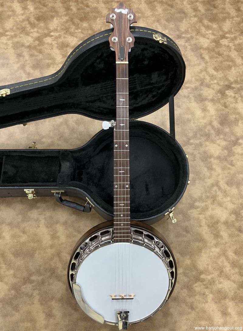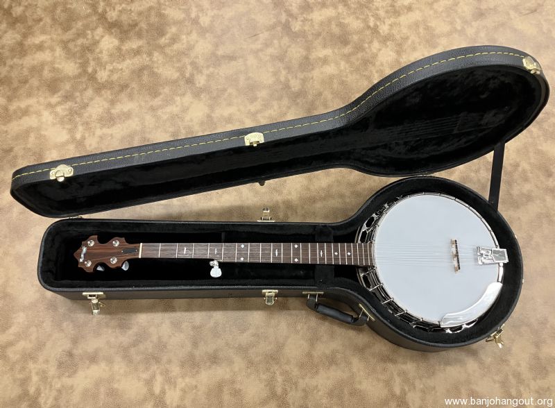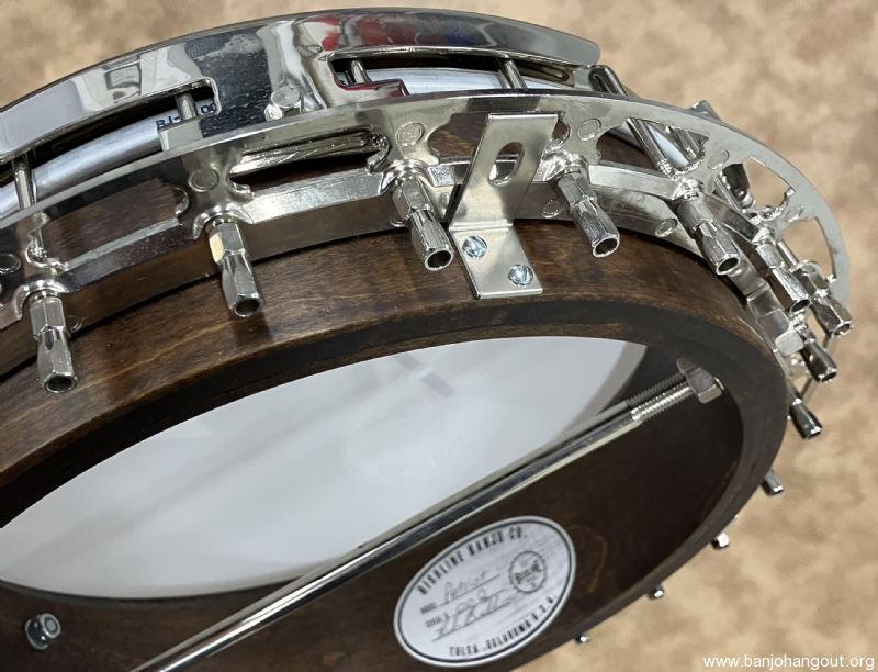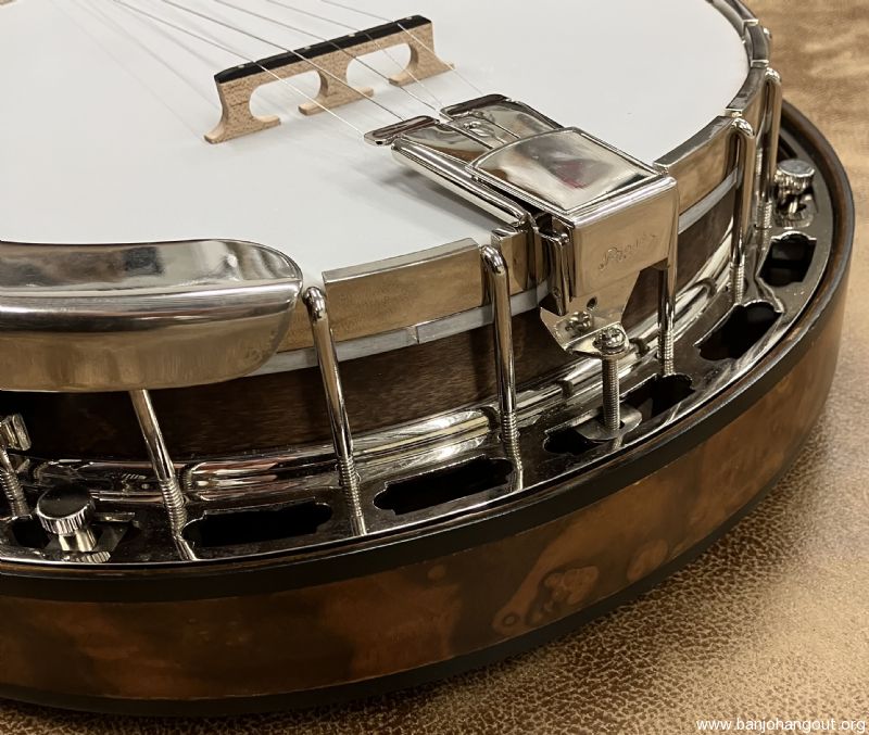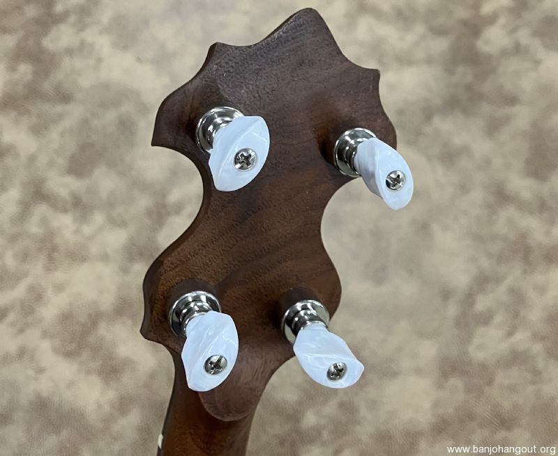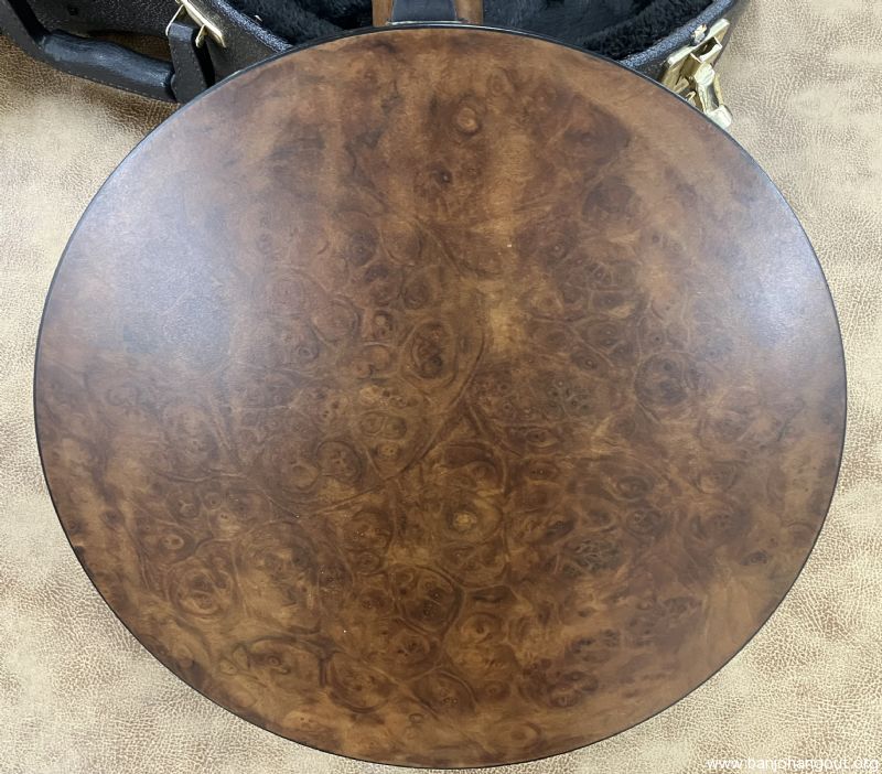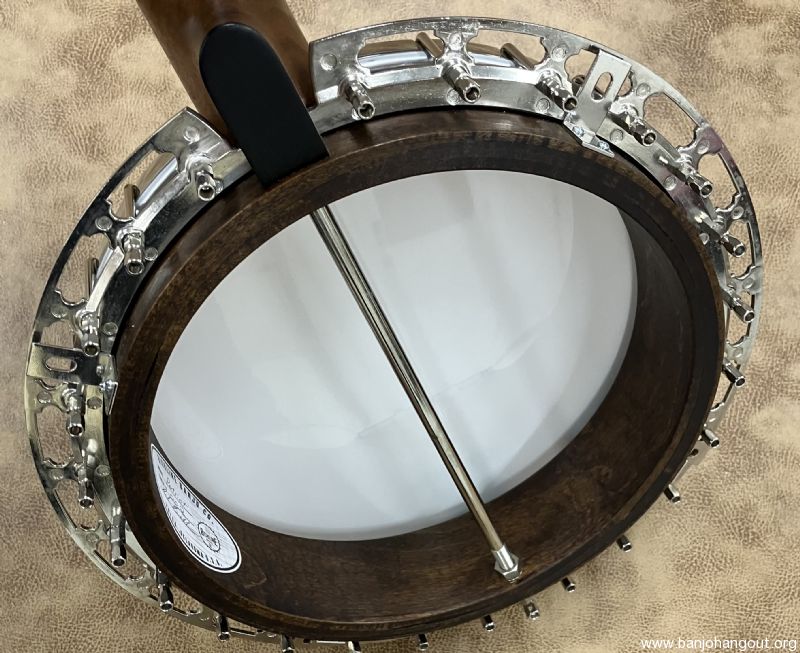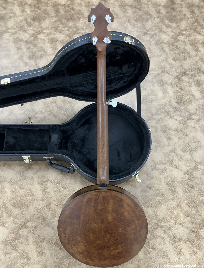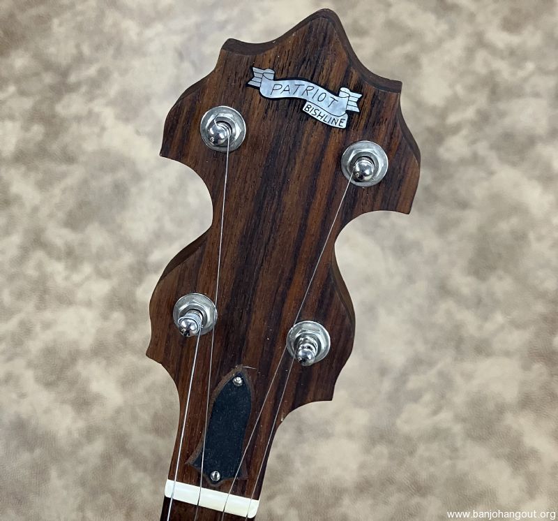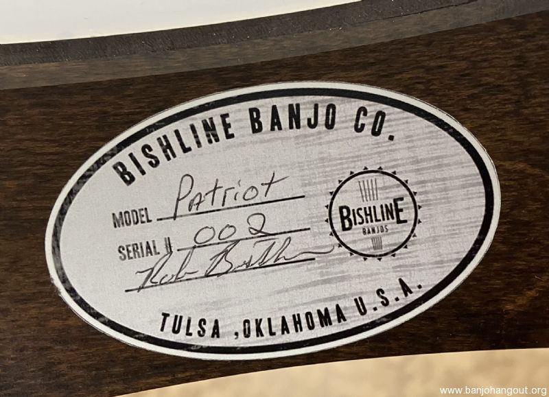 This "Patriot" from Rob Bishline is in fantastic condition featuring a beautiful walnut neck and resonator with a satin finish. As you can see, the resonator has beautiful burl walnut. The hardware shows a bit of patina and looks great as well. This banjo pot assembly has a 1/4" brass hoop which makes for a lighter weight at only 9 pounds. The banjo is extremely responsive as you can hear in the video. It has 5th string spikes installed and ships in a hard case. If you have any questions or desire additional pictures, don't hesitate to ask. Thanks for looking! Here's video of this banjo: youtube.com/watch?v=CBsAqloWWVQ