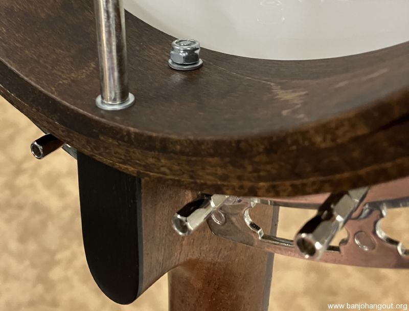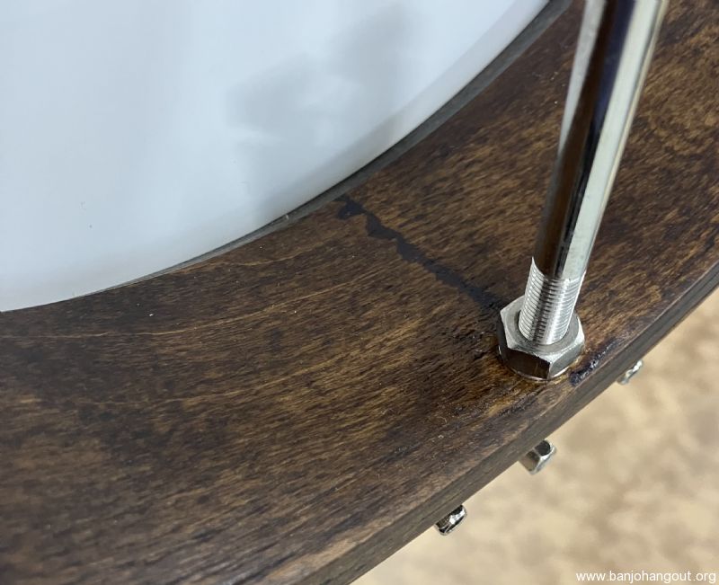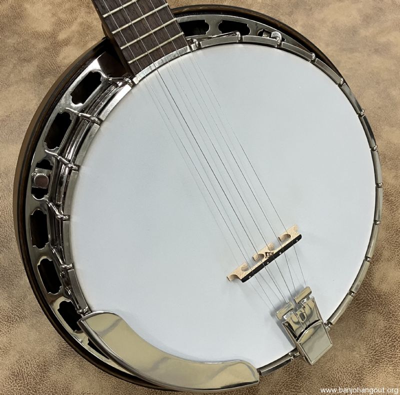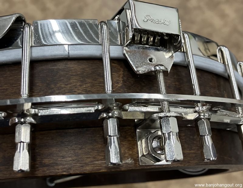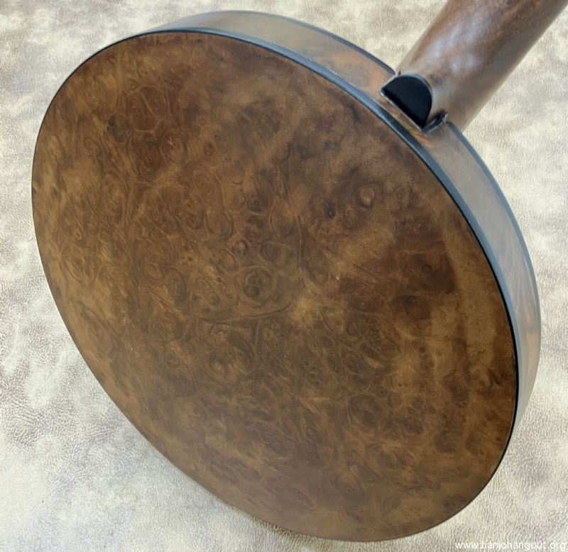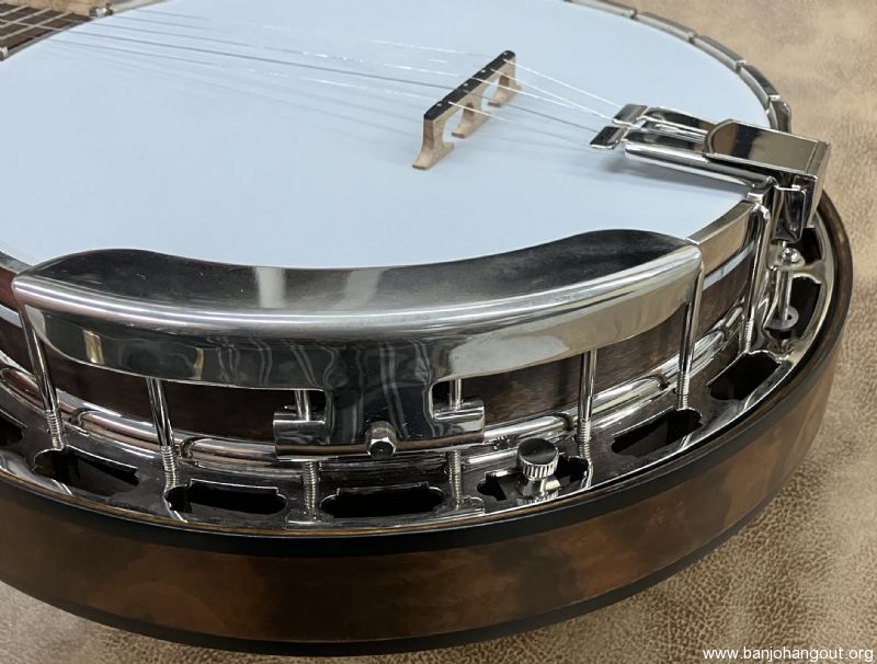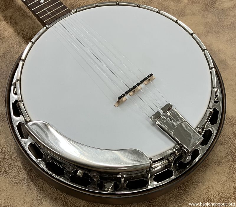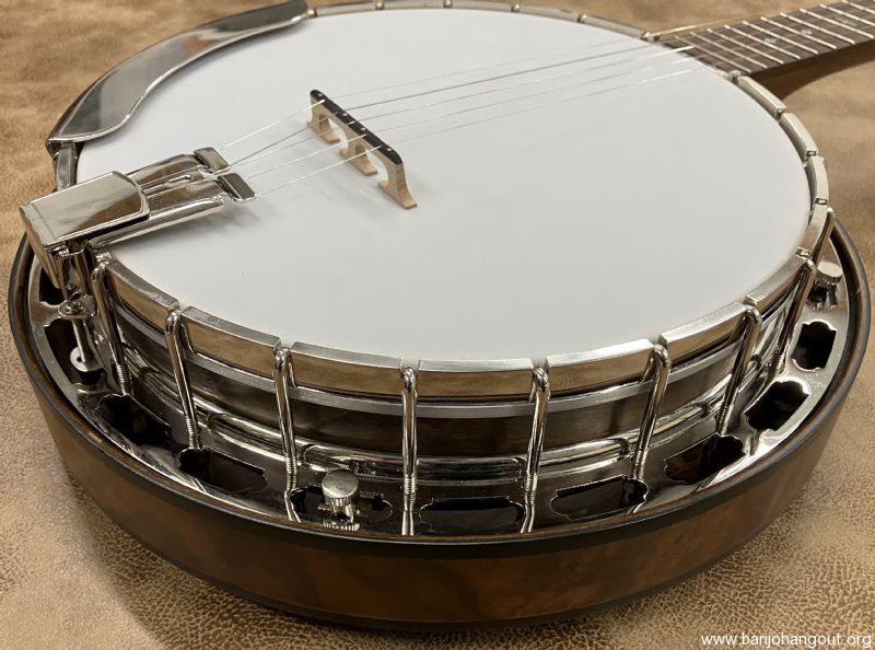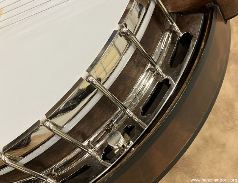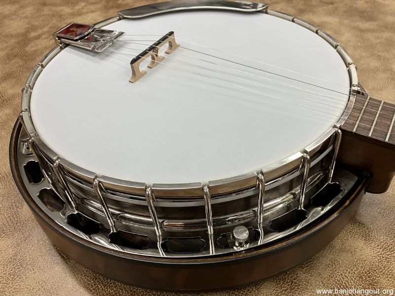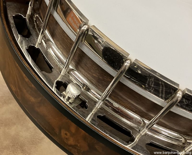 This "Patriot" from Rob Bishline is in fantastic condition featuring a beautiful walnut neck and resonator with a satin finish. As you can see, the resonator has beautiful burl walnut. The hardware shows a bit of patina and looks great as well. This banjo pot assembly has a 1/4" brass hoop which makes for a lighter weight at only 9 pounds. The banjo is extremely responsive as you can hear in the video. It has 5th string spikes installed and ships in a hard case. If you have any questions or desire additional pictures, don't hesitate to ask. Thanks for looking! Here's video of this banjo: youtube.com/watch?v=CBsAqloWWVQ