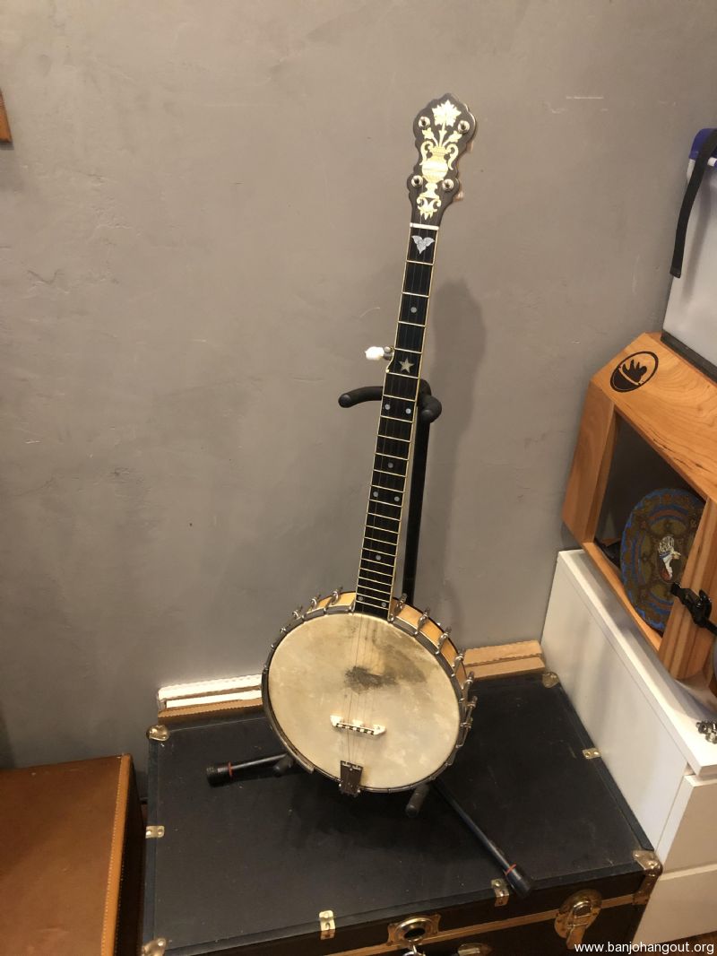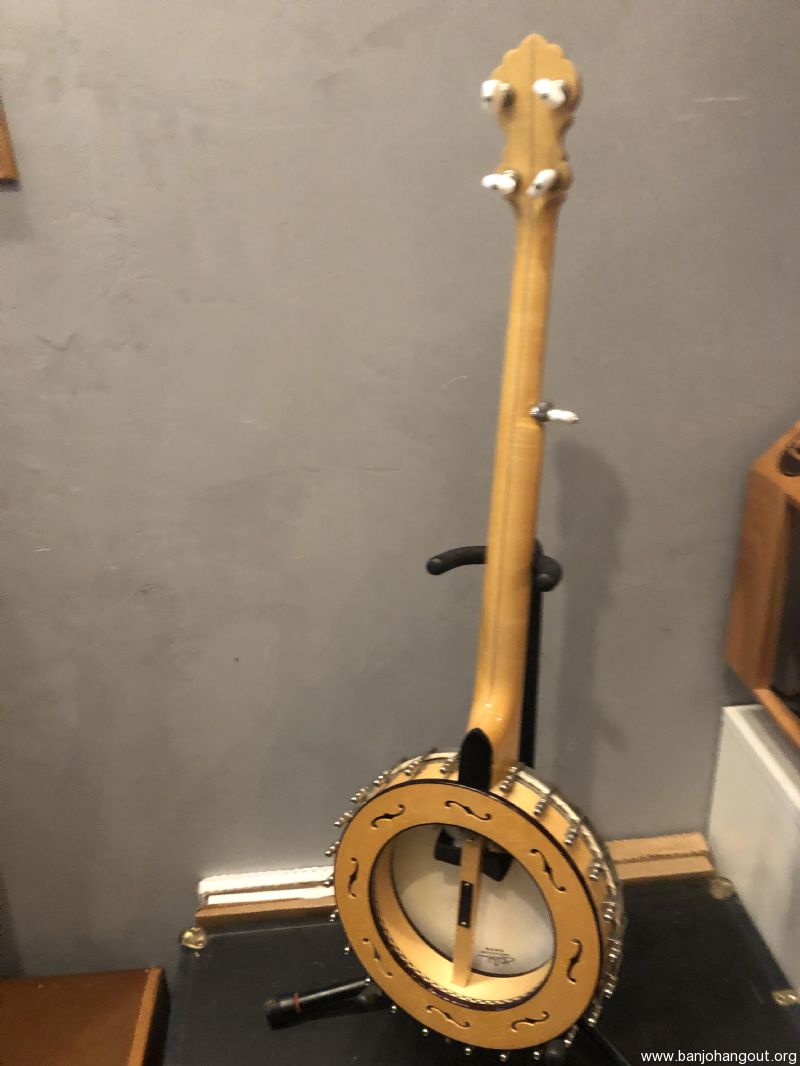 Rim Construction: Bacon-style tone ring 11 inch diameter Two ply laminated maple 1/2 inch wall thickness Maple resonator back Maple inner ring Tortoise shell binding Notched tension hoop 24 L-shoe brackets Waverly tailpiece 5/8 inch ebony top bridge Fiberskyn 2 head (upgraded to John Balch skin head; I can include the original Fiberskyn head if you want it)