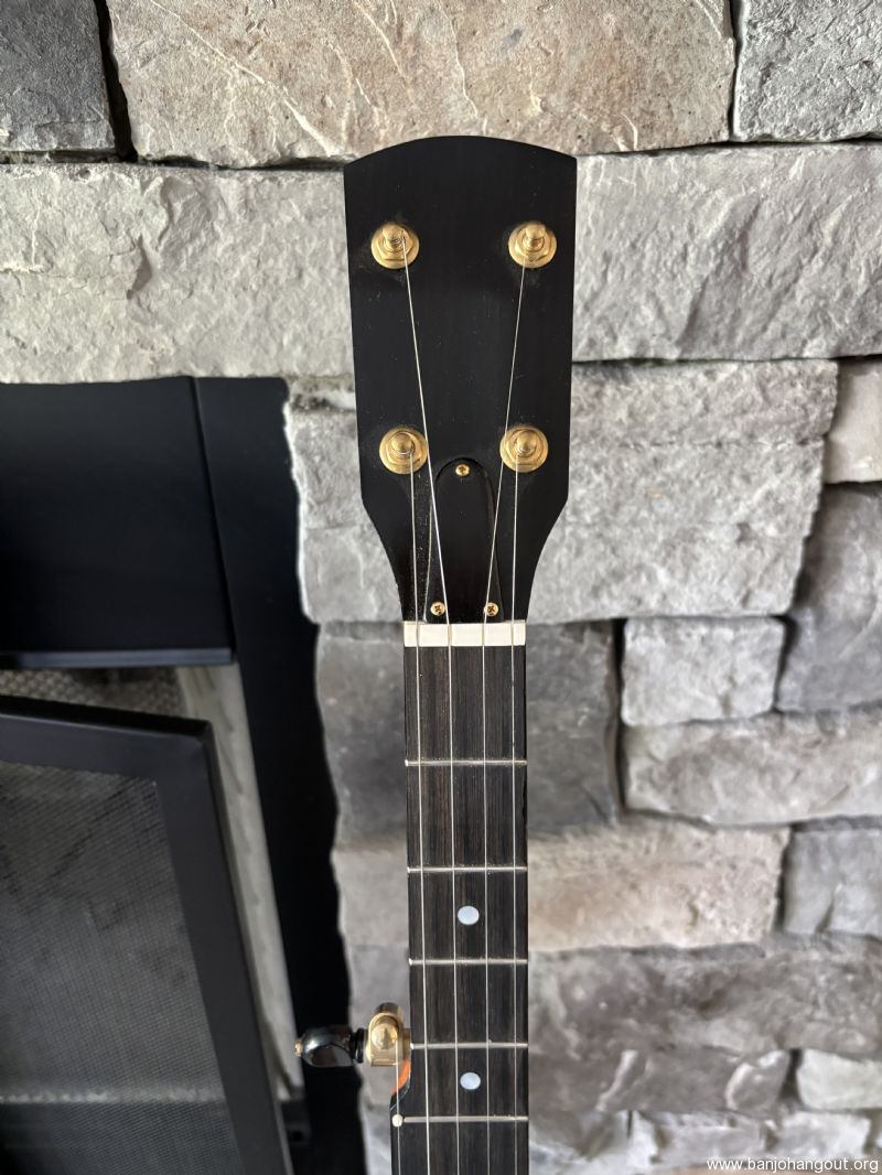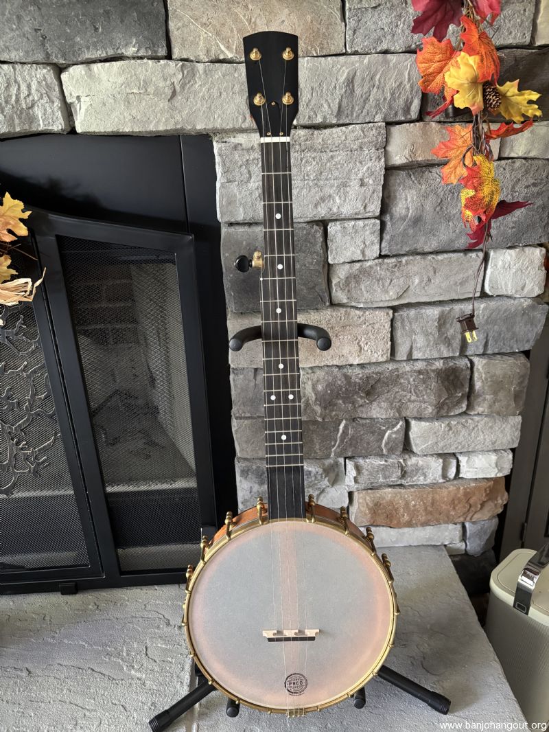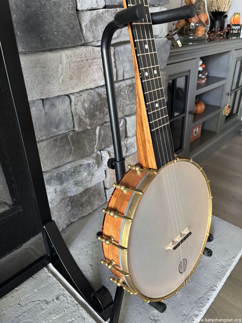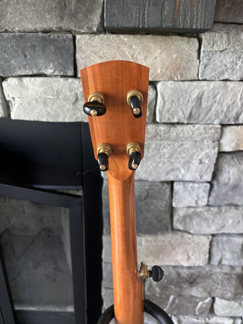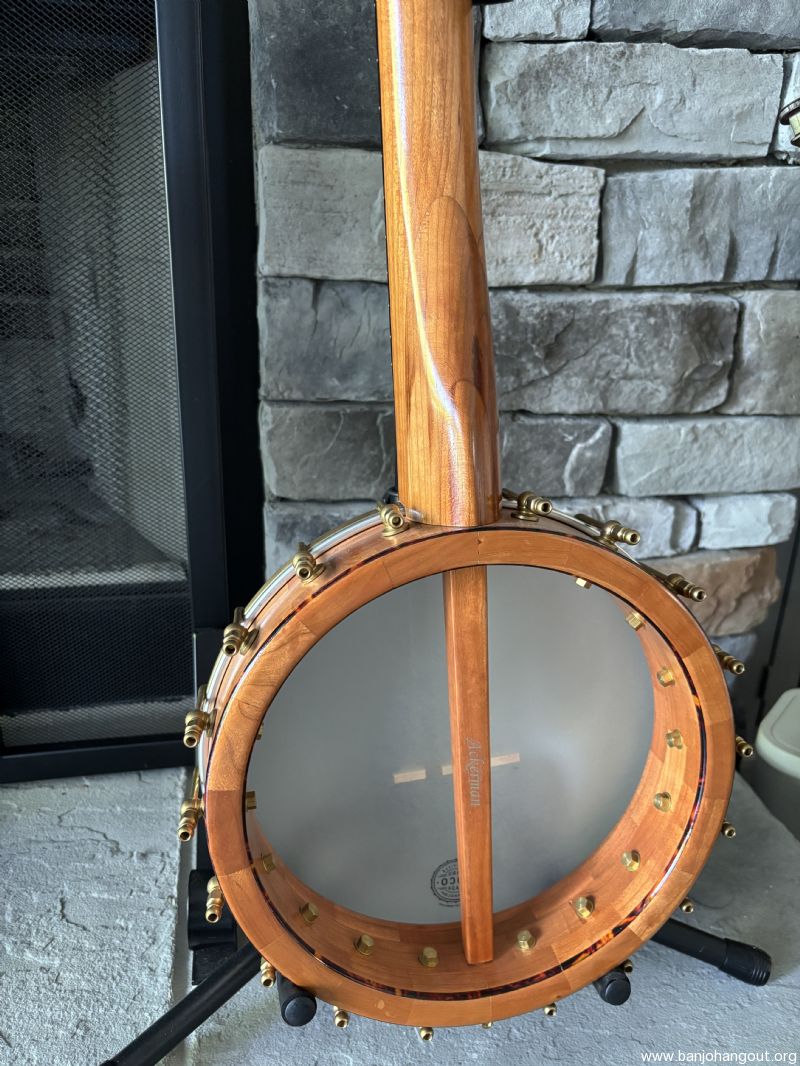 NEW: Dobson style solid cherry banjo. Traditional heel, paddle headstock. African Blackwood fretboard and headstock overlay. Brass hardware with brass bar tone ring. Gotoh tuners, Elite banjo head. 2 way adjustable truss rod. Updated: 11/2/25