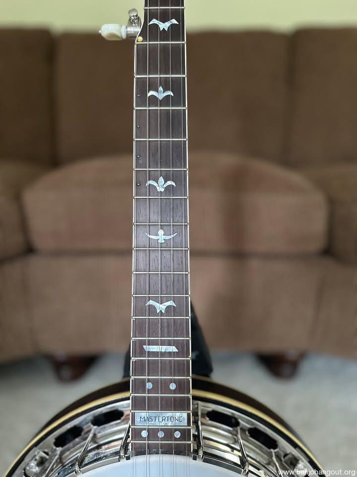 1931 RB1 Pot Mahogany "Speed" Neck by Don Bryant Blaylock TR Gotoh's and 5th Gotoh 1.250 at nut .825 at 12th fret double cut pegged with Fleur de Lis Clunky Gibson names straight across good V shape from 1st to 5th .656 bridge action .090 at 12th fret Mastertone black at 21st fret A, Bflat, B and C spikes Mastertone block at 21st fret
