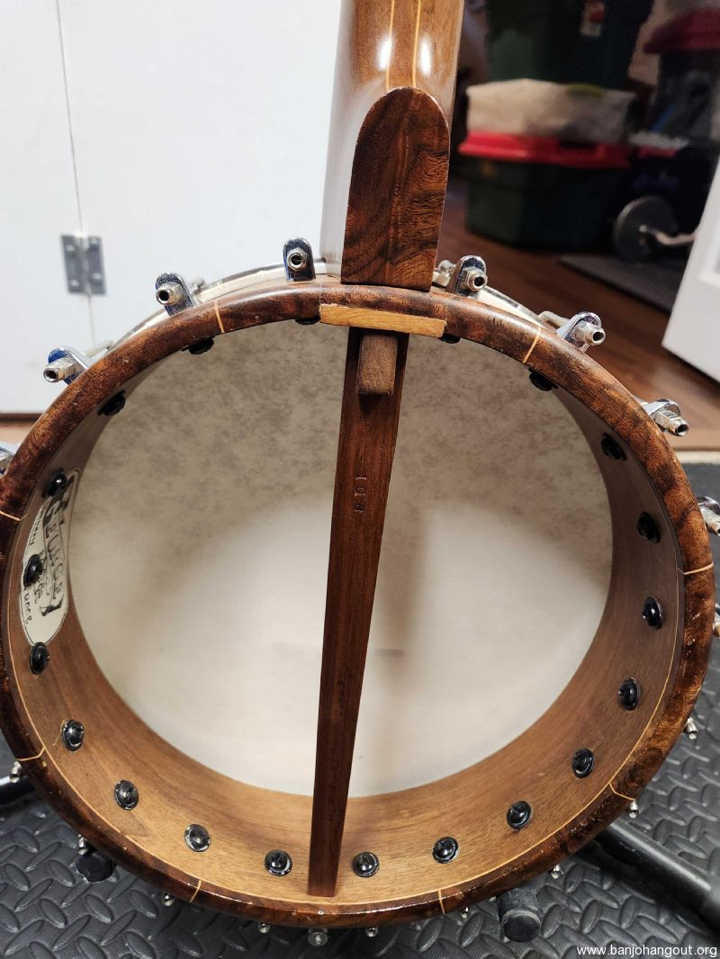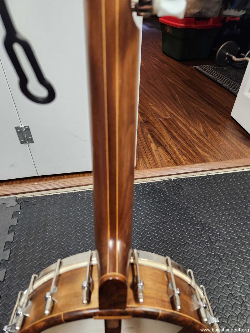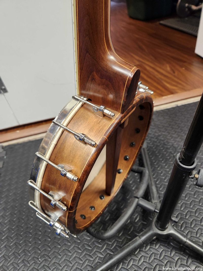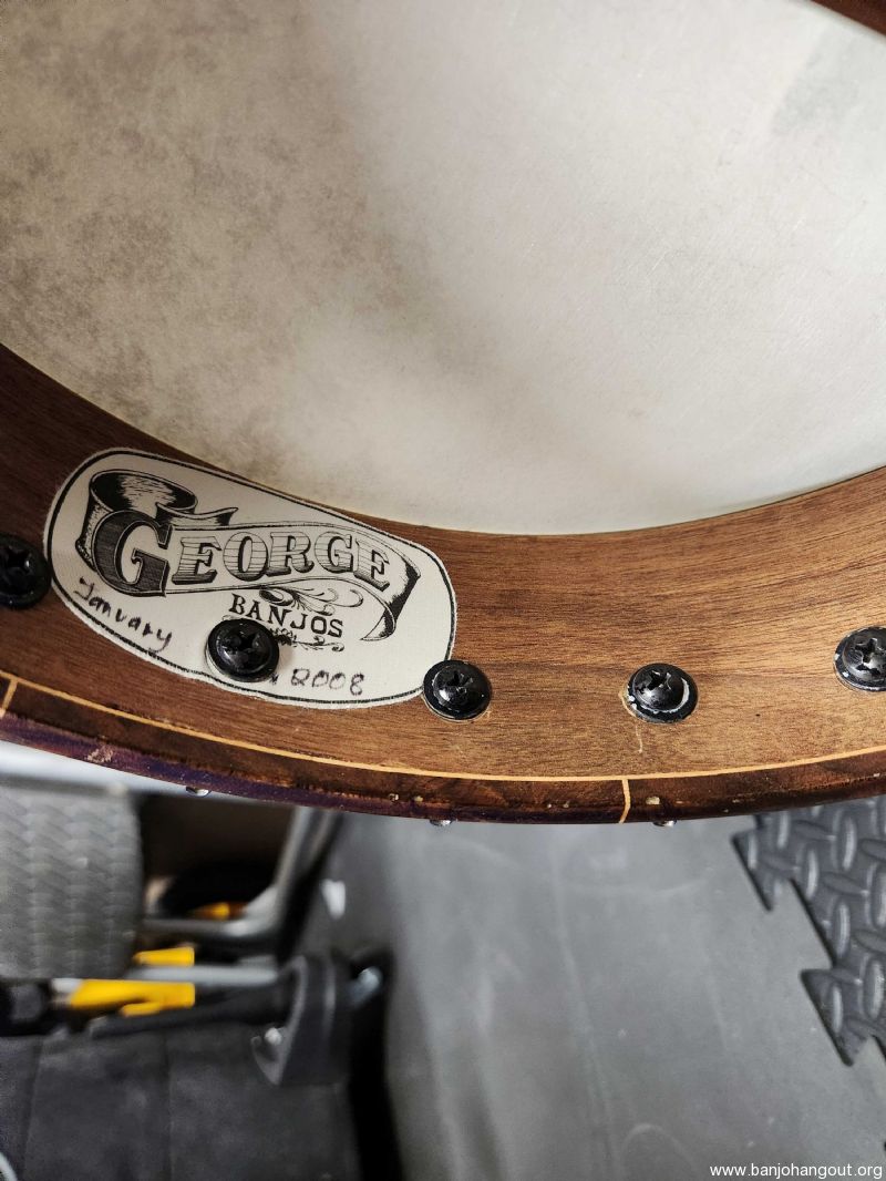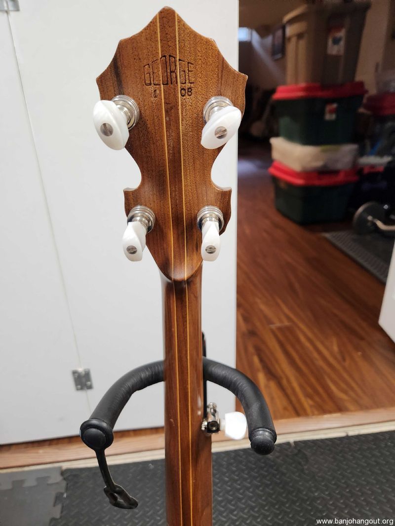 Tommy George short scale banjo built in Jan 2008. Is has a 22 1/8" scale neck with a 1 3/16" wide nut. The neck is walnut and I am not sure of the 11" pot wood but it has a matching walnut veneer. There is an area where the veneer lifted and cracked and the previous repair was not aesthetically pleasing, but does not impact it playing. Has its original hide head and the tone ring is a heavy brass rolled ring. It is a comfortable banjo to play given the shorter scale. I do not have a case for this banjo but will pack it securely for shipping. Let me know if you have any questions or want more photos .