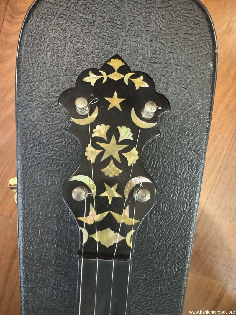 S.S Stewart Thoroughbred 1890’s five string open back banjo. SN 13772. Excellent condition with hard shell resonator type case. A beautiful looking and sounding instrument. All original except for 5th string peg. Has Remo fiberskyn head. Cash only, must see in person will not ship, sorry.