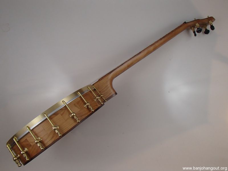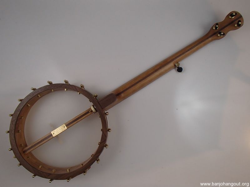 This banjo has a cherry rim, neck and Romero-style armrest, walnut trim and a curly walnut peghead overlay, a jatoba fretboard, and raw brass hardware. The wood has a Tru Oil finish. I will sell the banjo without the armrest for $30 less. The 12" block rim has a wood tone ring profile turned into the top. The head is a Renaissance, and I can exchange it for a Fiberskyn at no charge. I made the Van Eps style tension hoop and the dowel stick yoke. The head, tailpiece, strings, and Gotoh tuners came from Smakula Fretted Instruments and the hooks, nuts, shoes and endbolt came from Ode Banjos. The brass plate on the dowel stick has my name, the banjo number, and the town and year of production. There is a two way truss rod in the neck, accessed from the heel. The scale length is 25-1/2", and the nut is 1-3/8" wide and made from Corian. The 5th string nut is tall, to keep all the strings in the same plane, but I can shorten it so the 5th string rests on the 5th fret if you prefer. I can add 5th string spikes for $5 each. If you want a case I can send the banjo in a Superior CD-1536 or CD-2536 for $175. It is also fine to ship the banjo without a case if you don’t want one. To see a short video demonstration of this banjo please follow the link below: youtu.be/qCBSUtENarw