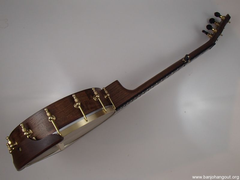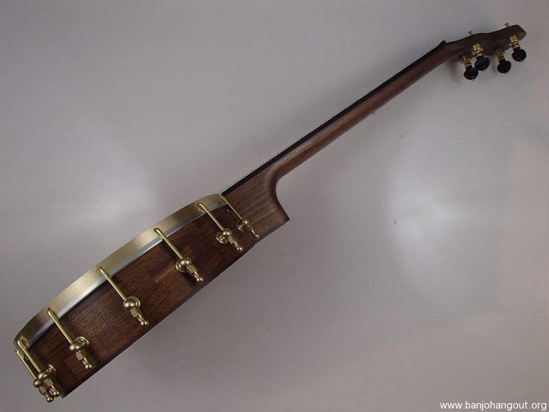 This banjo has a walnut rim, neck and Romero-style armrest, a streaky ebony fretboard, and raw brass hardware. The wood has a Tru Oil finish. I will sell the banjo without the armrest for $35 less. The 11" block rim has a wood tone ring profile turned into the top. The head is a Renaissance, and I can exchange it for a Fiberskyn at no charge. I made the Van Eps style tension hoop and the dowel stick yoke. The head, tailpiece, strings, and Gotoh tuners came from Smakula Fretted Instruments and the hooks, nuts, shoes and endbolt came from Ode Banjos. The brass plate on the dowel stick has my name, the banjo number, and the town and year of production. There is a two way truss rod in the neck, accessed from the heel. The scale length is 23", and the nut is 1-3/8" wide and made from Corian. The 5th string nut is tall, to keep all the strings in the same plane, but I can shorten it so the 5th string rests on the 5th fret if you prefer. I can add 5th string spikes for $5 each. I don’t have a case to fit this banjo size. To see a short video demonstration of this banjo please follow the link below: youtu.be/8ZWCVGOqDCI