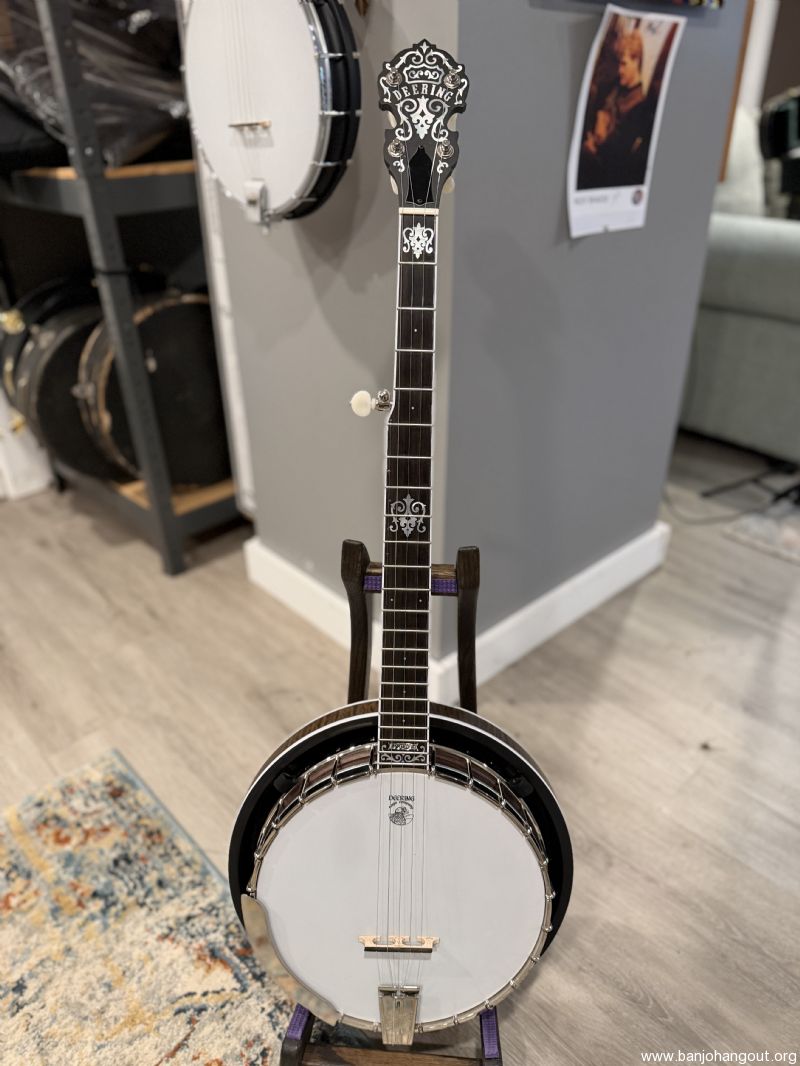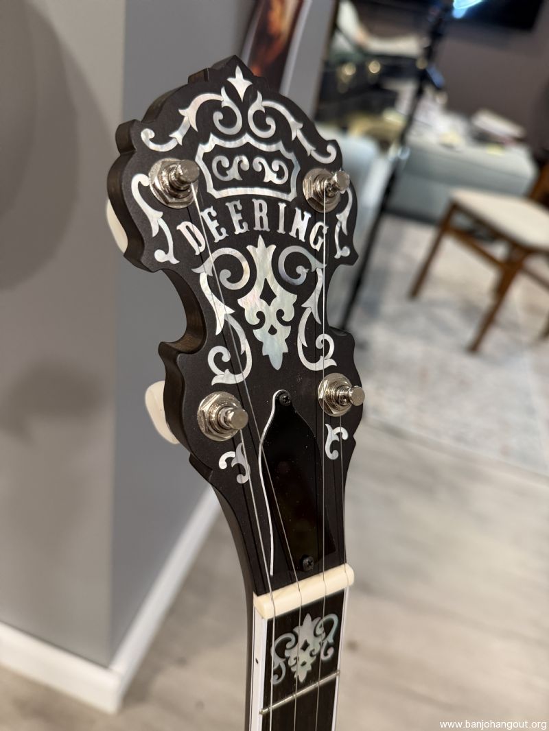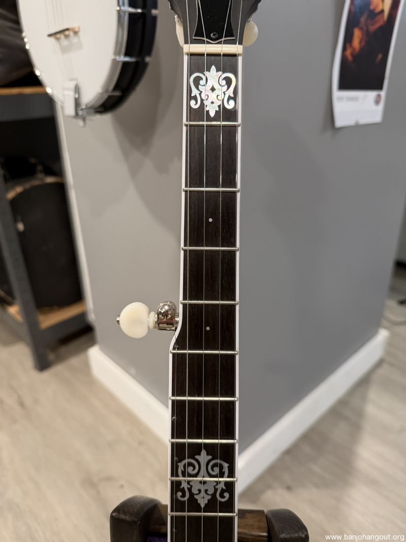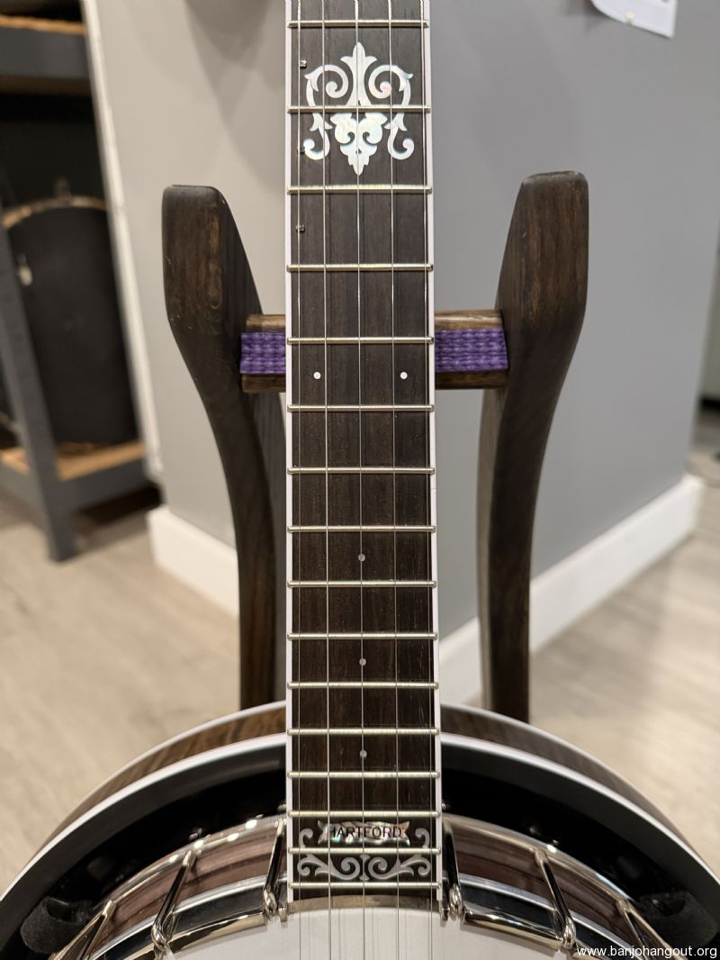 Removable resonators allow a player to easily switch between open back and resonator without the hassle of removing the flange and mounting brackets while the wooden tone ring produces a much softer tone- also lightening the banjo considerably. To top it off the intricate inlay patterns are themed after the architecture found in old steamboats- a favorite subject of Hartford- and are some of our favorite in the shop.Fresh setup, plays and sounds exactly as it should!