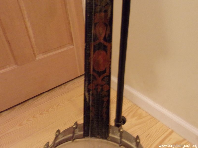 For sale is an 1890's or so fretless five string, with marquetry fingerboard(Bob Smakula believed it to be a Buckbee) , it currently has steel strings on it, I have never played or tuned this instrument, or changed them from what this came with-so, they are still on it. Violin style friction pegs, ball shoes, very cool engraved tailpiece, 11" spun over German Silver Rim. It seems to be pretty original, excepting the strings and the bridge. Skin head. No case, but it will be packed securely for shipping. I am only charging $25.00 for shipping, and I will pay anything over that for the lower 48 states. International pays the full bill. BTW, sorry about the blurry close ups, I haven't figured out how to take clear ones yet! Thanks for looking, and take care, Don