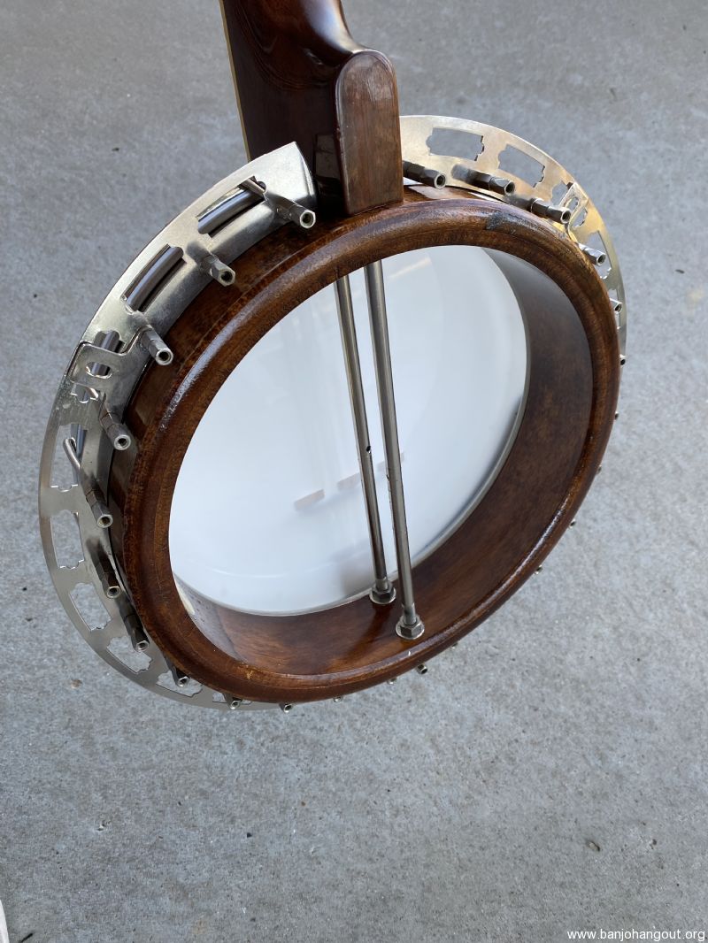 All hardware on this banjo appears original, save for a modern presto tailpiece and a mismatched T bracket. The flange is a two piece tube and plate construction. As usual on a style 250, it has a mahogany neck and resonator.