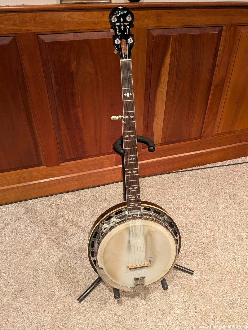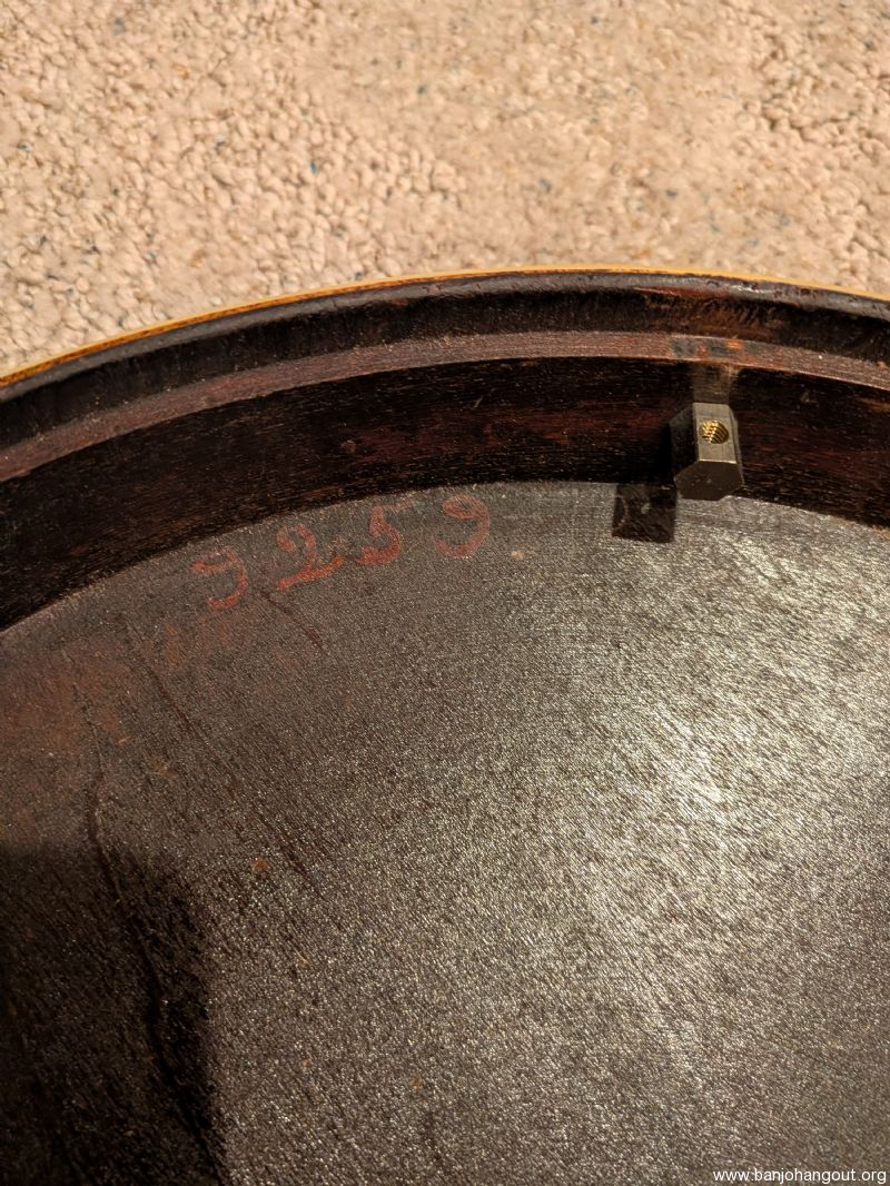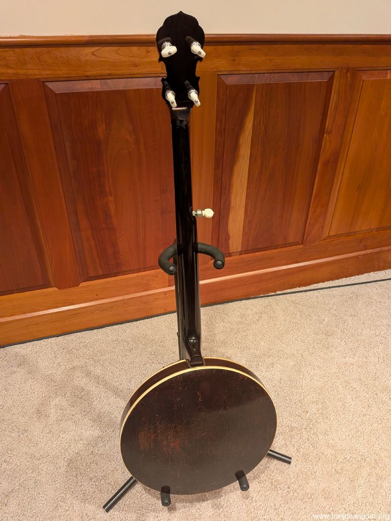Up for sale is my 1929 Gibson TB-3 conversion, F.O.N 9259-12. It's a two piece flange 40 hole arch top with a great playing mahogany Frank Neat neck. All of the hardware is original, minus the tailpiece, though it is still a pre war presto. Has 5 Star tuners on it that work pretty well. It currently has a vintage Snuffy Smith bridge on it. It has great tone as an arch top and sounds great with a conversion ring as well, though I sold the conversion ring I had for it.