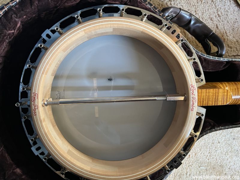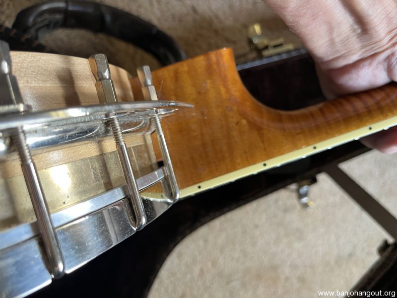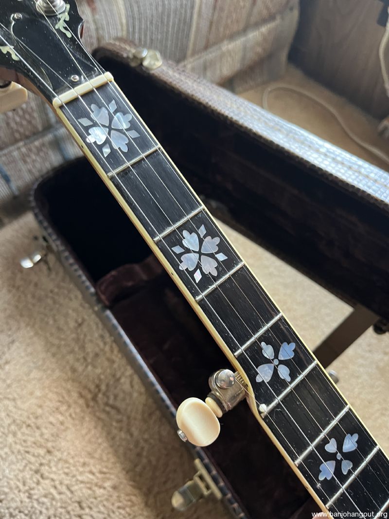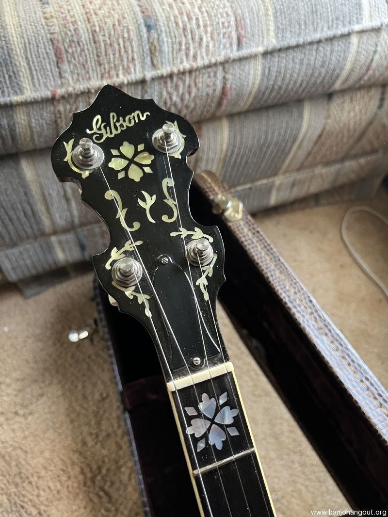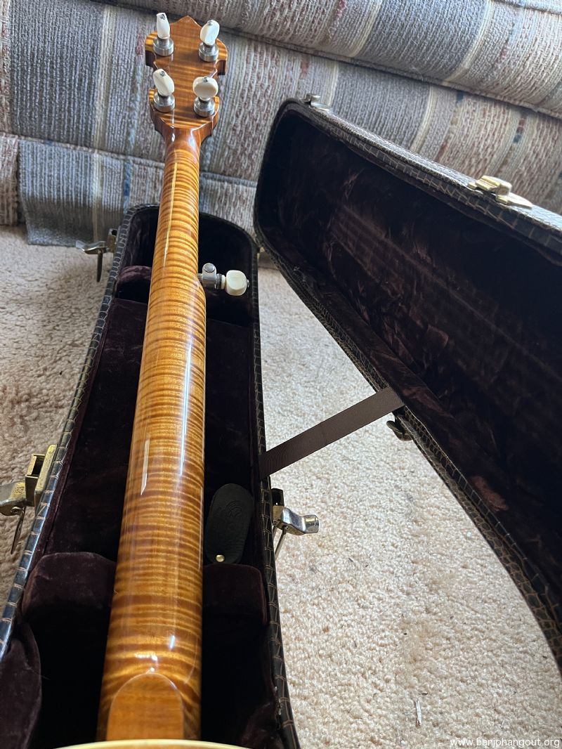Banjo is copy of Gibson Earl Scruggs model it was built by a luthier in North Carolina. It has a no hole blaylock tonering and a Tony Pass Lost Timbre rim it was copied after the first Scruggs that came out in the 80s with exception of the peg head they had a smaller peg head this one is standard size. I’ve had several original Scruggs banjos none sounded any better than this one. It has been recently set up by Richie Dotson