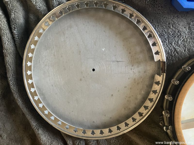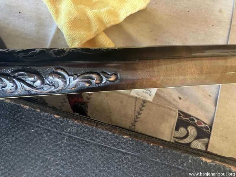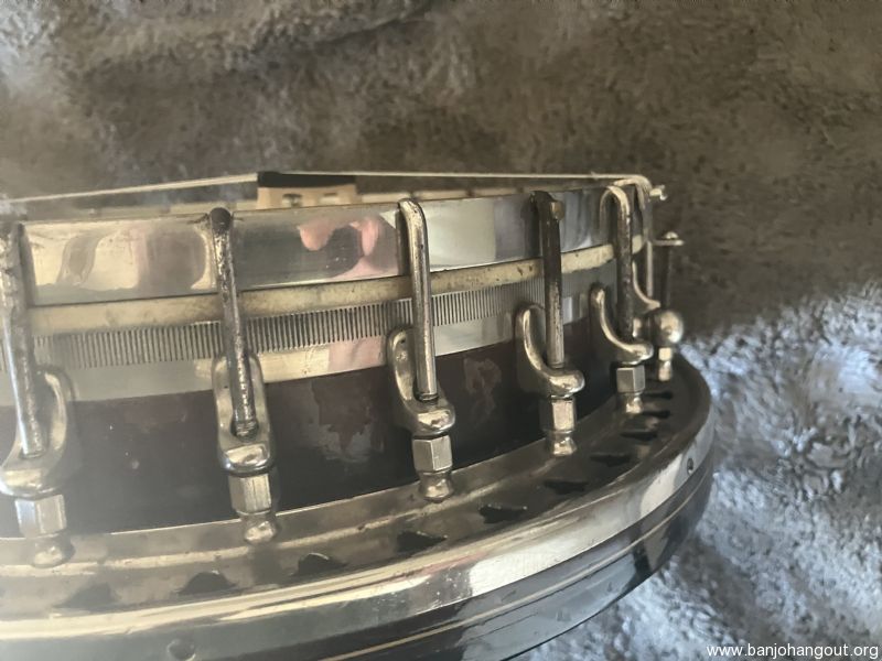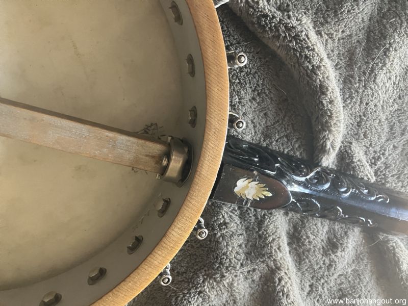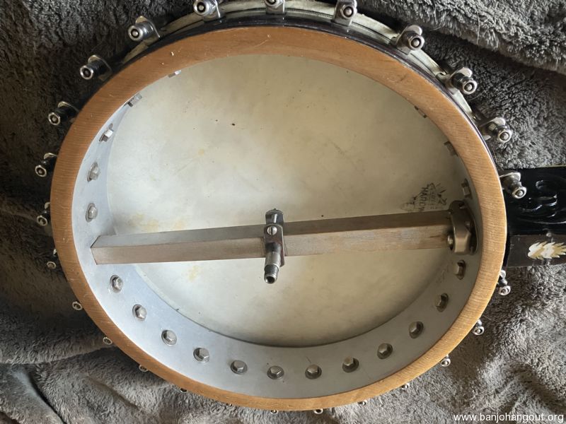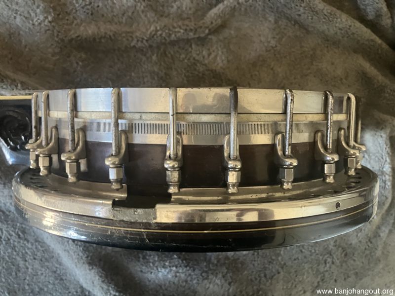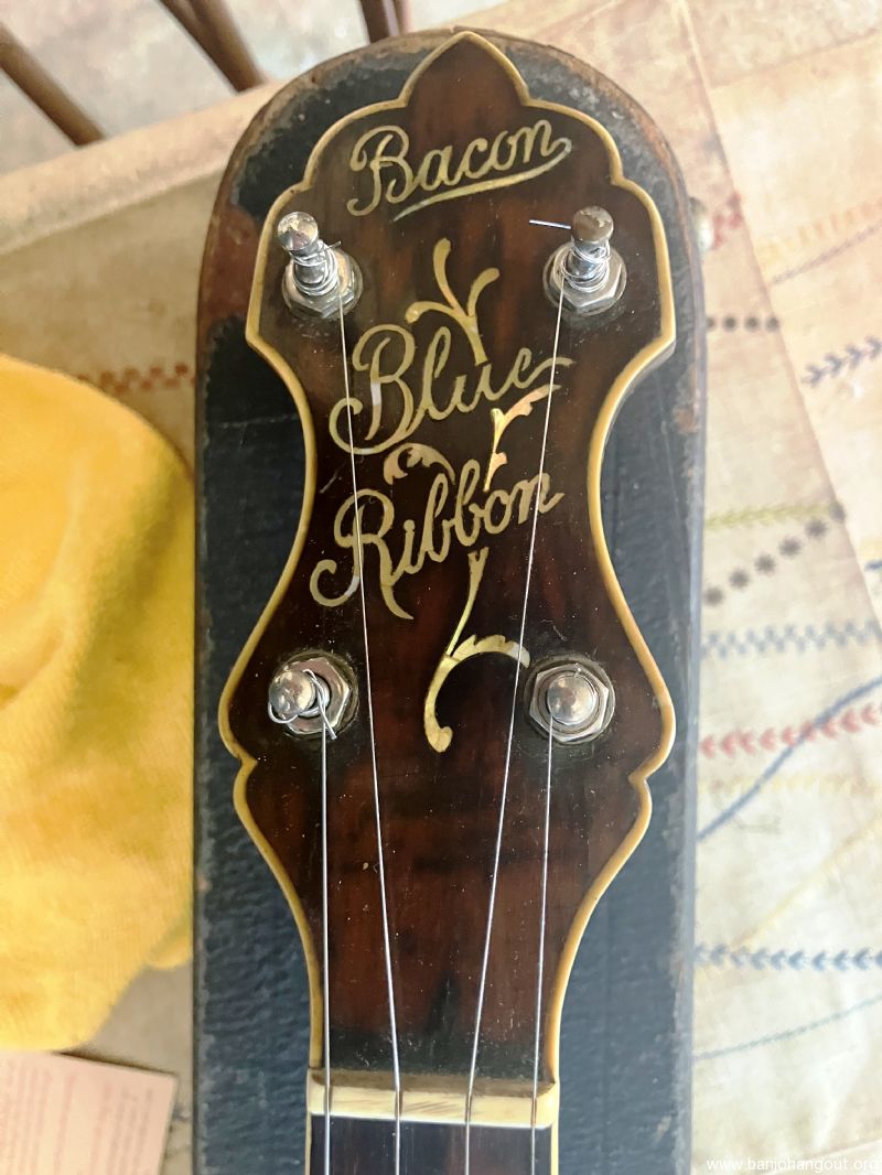 his is a rare and original Bacon five string that was most likely custom ordered in 1929 (serial number 27715). The maple neck features a bound peghead with pearl script reading "Bacon Blue Ribbon". The neck is bound and the heel is elaborately carved to the 12th fret. The rim is fitted with a resonator with "tulip" cutouts in the flange. It is fitted with an unusual, but simple tonering. The rim and interior of the resonator are typical silver paint but the dowel stick has no Bacon stamp or serial number. Since most Blue Ribbons are from an earlier time period with much lower serial number, we might assume that this banjo was either put together at the factory or the neck was retro fitted in the 1920s with the newer rim. It is a perfect player. in VG+ condition.